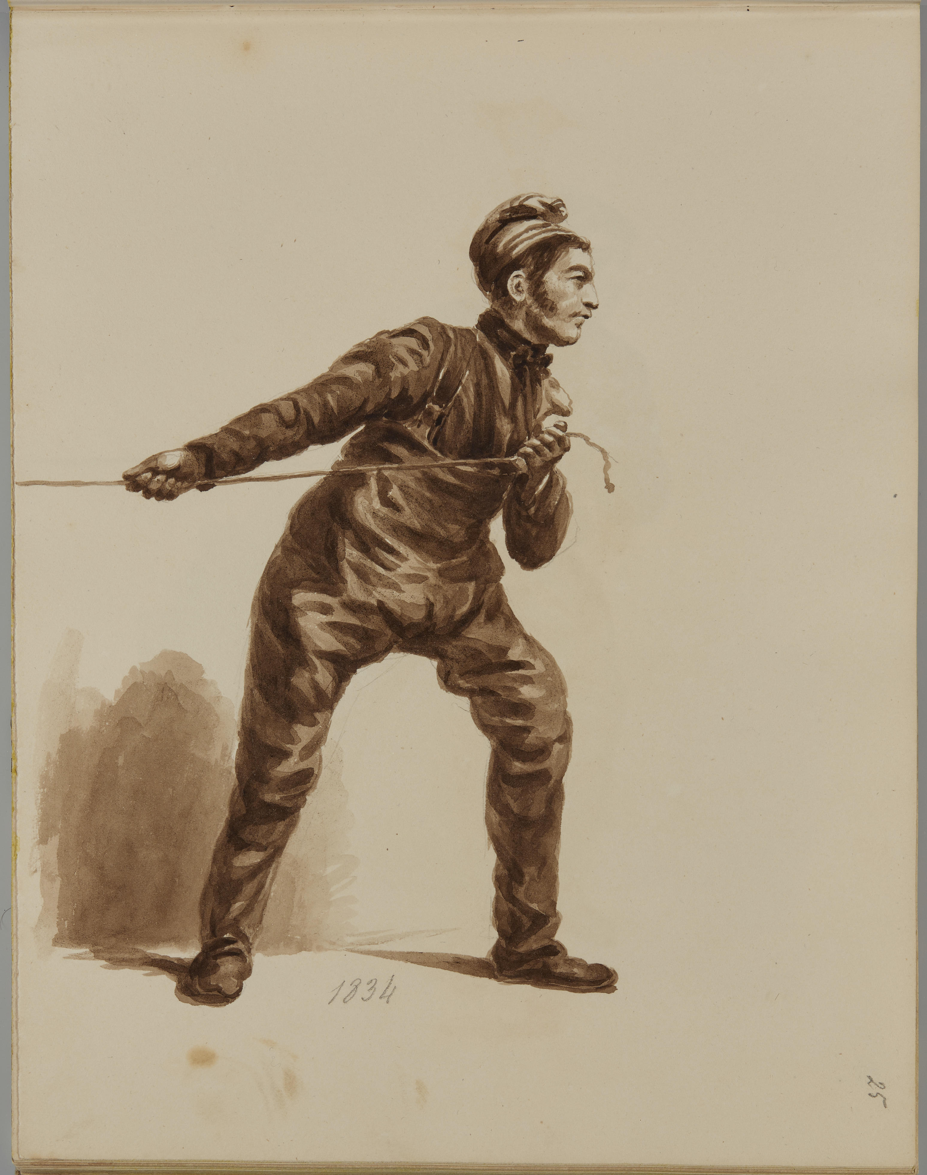 Sepiatekening van een touwtrekkende man in een oliebroek, afkomstig uit het schetsboek van J. Looyen (plaat 25).