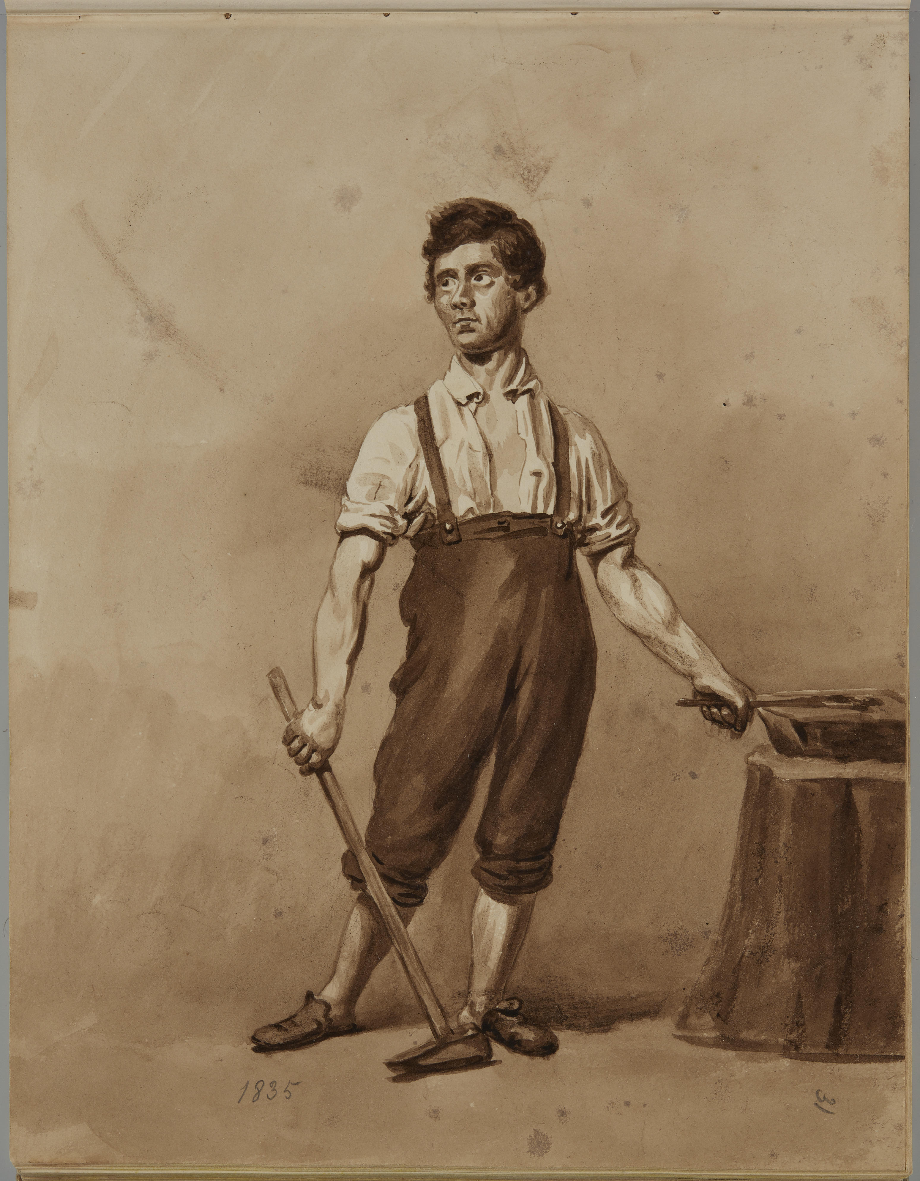Sepiatekening van een smid, afkomstig uit het schetsboek van J. Looyen (plaat 31).
