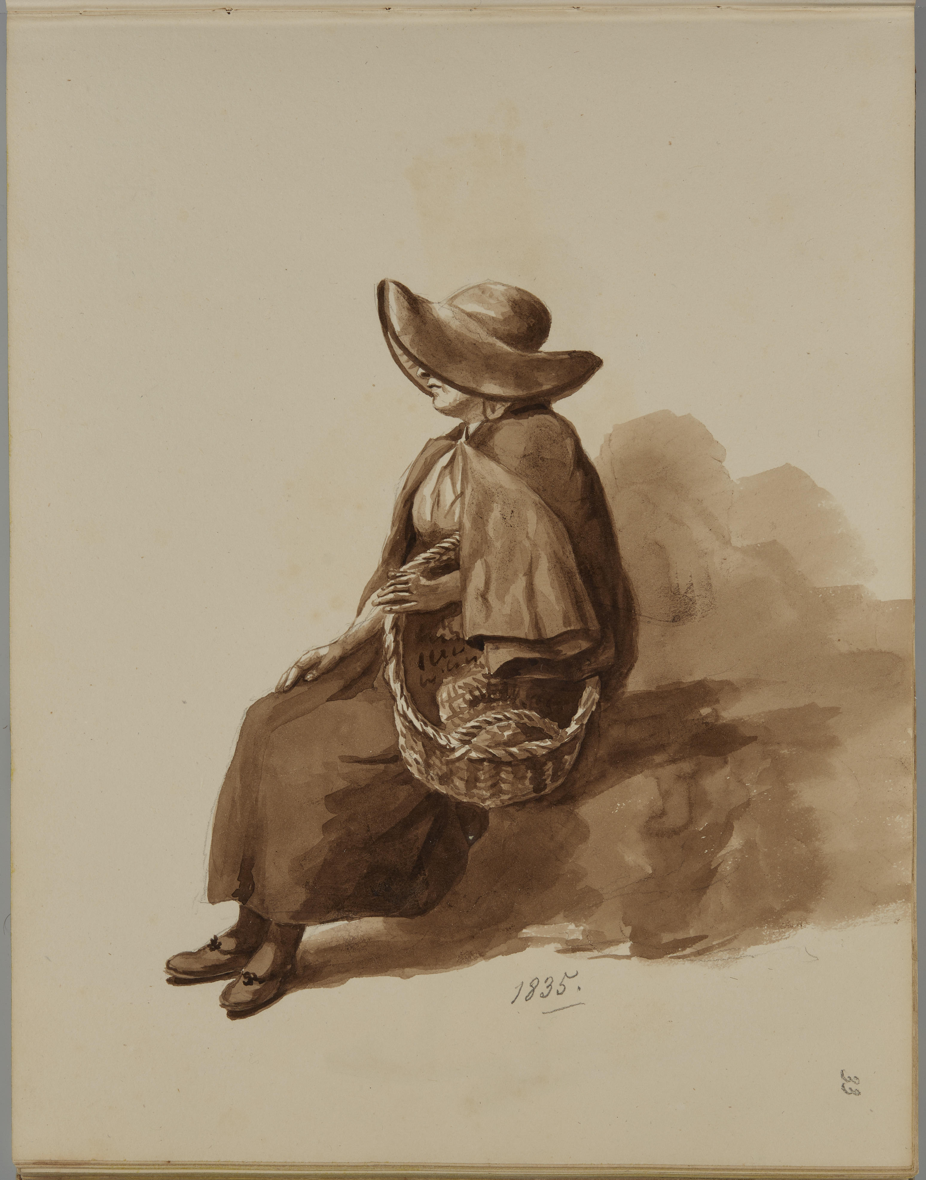 Sepiatekening van een vrouw met een mand uit Scheveningen, afkomstig uit het schetsboek van J. Looyen (plaat 33).