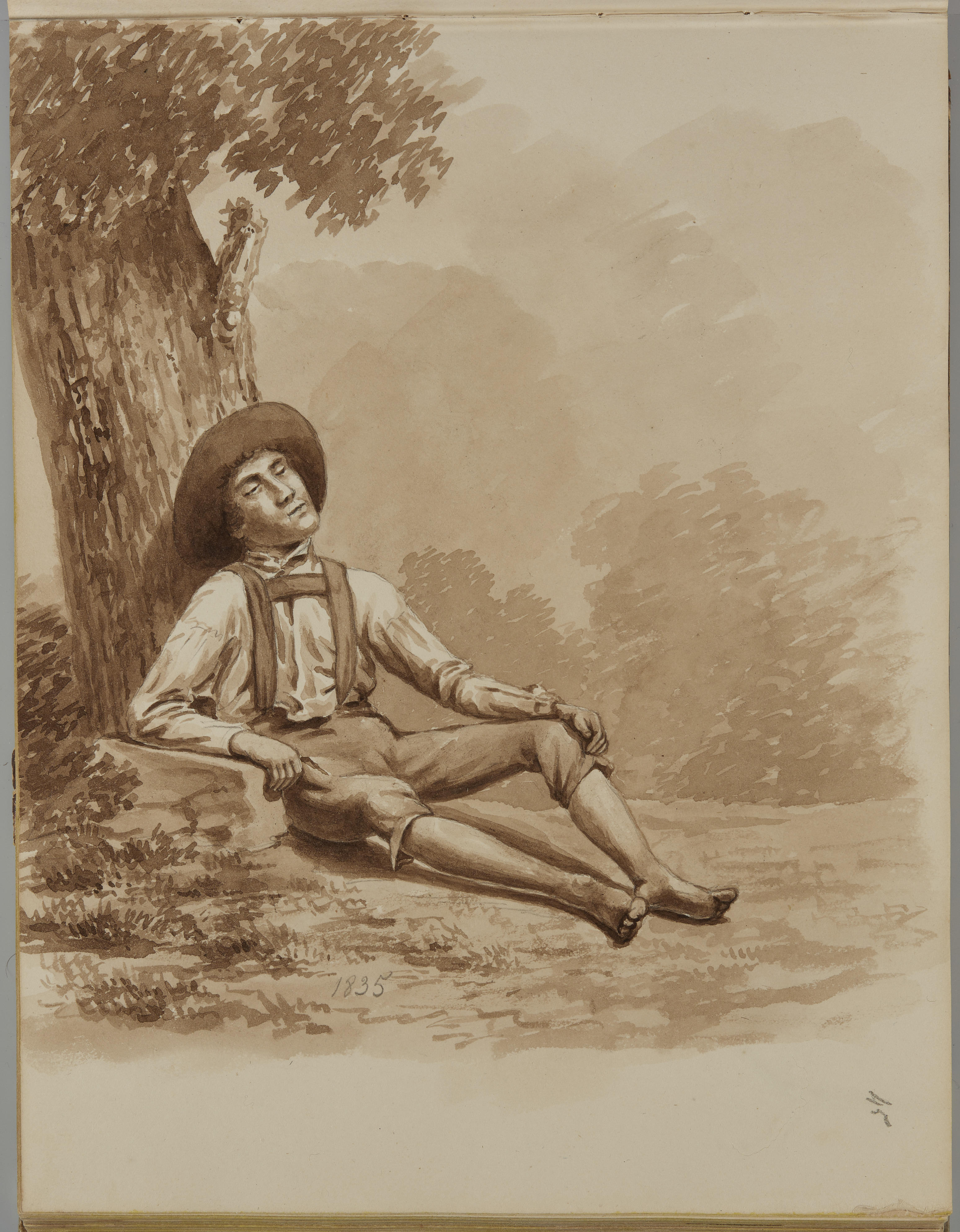 Sepiatekening van een man die tegen een boom zit, afkomstig uit het schetsboek van J. Looyen (plaat 45).