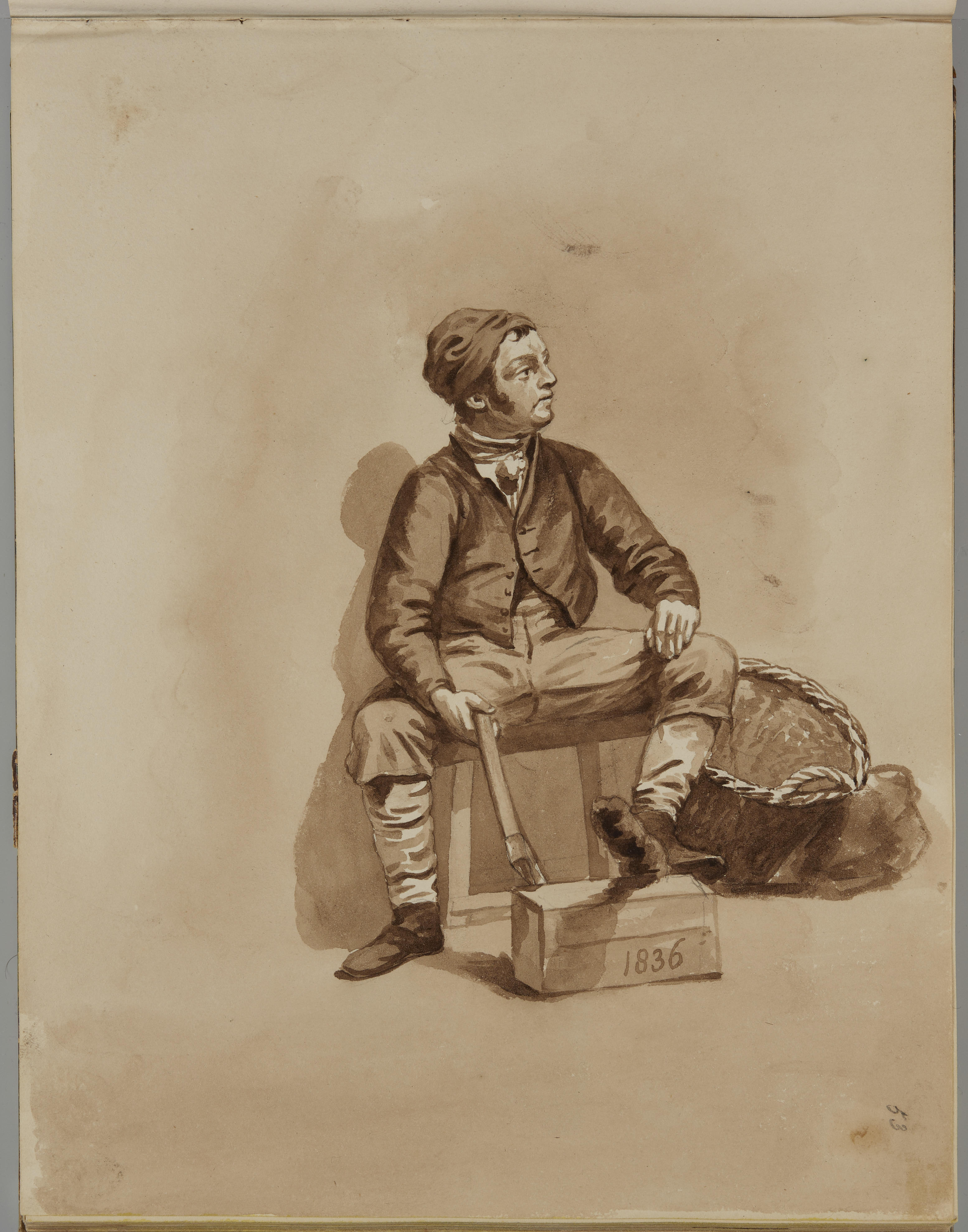 Sepiatekening van een zittende man met een bijl in zijn rechterhand, afkomstig uit het schetsboek van J. Looyen (plaat 53).