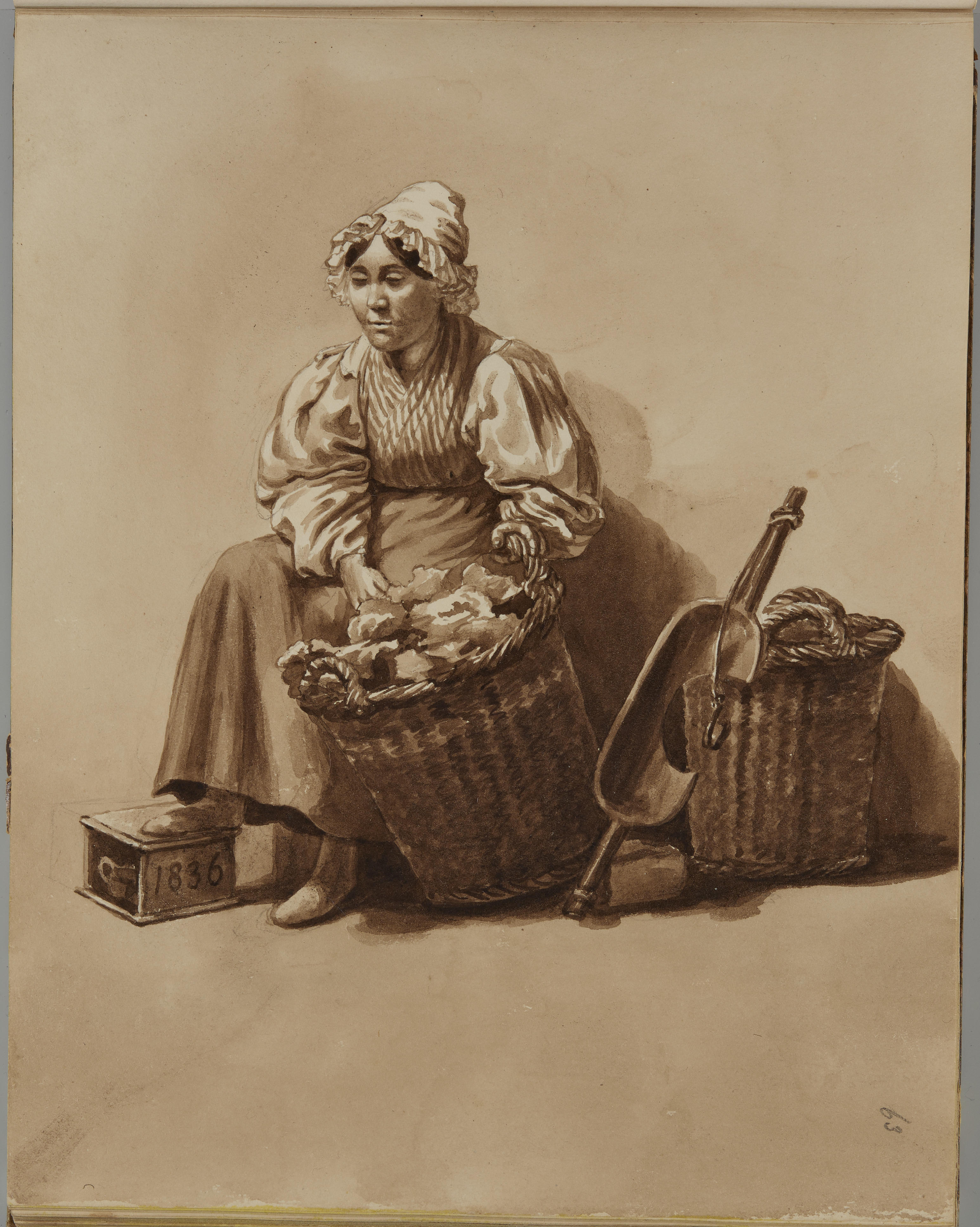 Sepiatekening van een groentenverkoopster, afkomstig uit het schetsboek van J. Looyen (plaat 63). Naast de vrouw staan twee manden en een juk. Haar voet rust op een stoof.