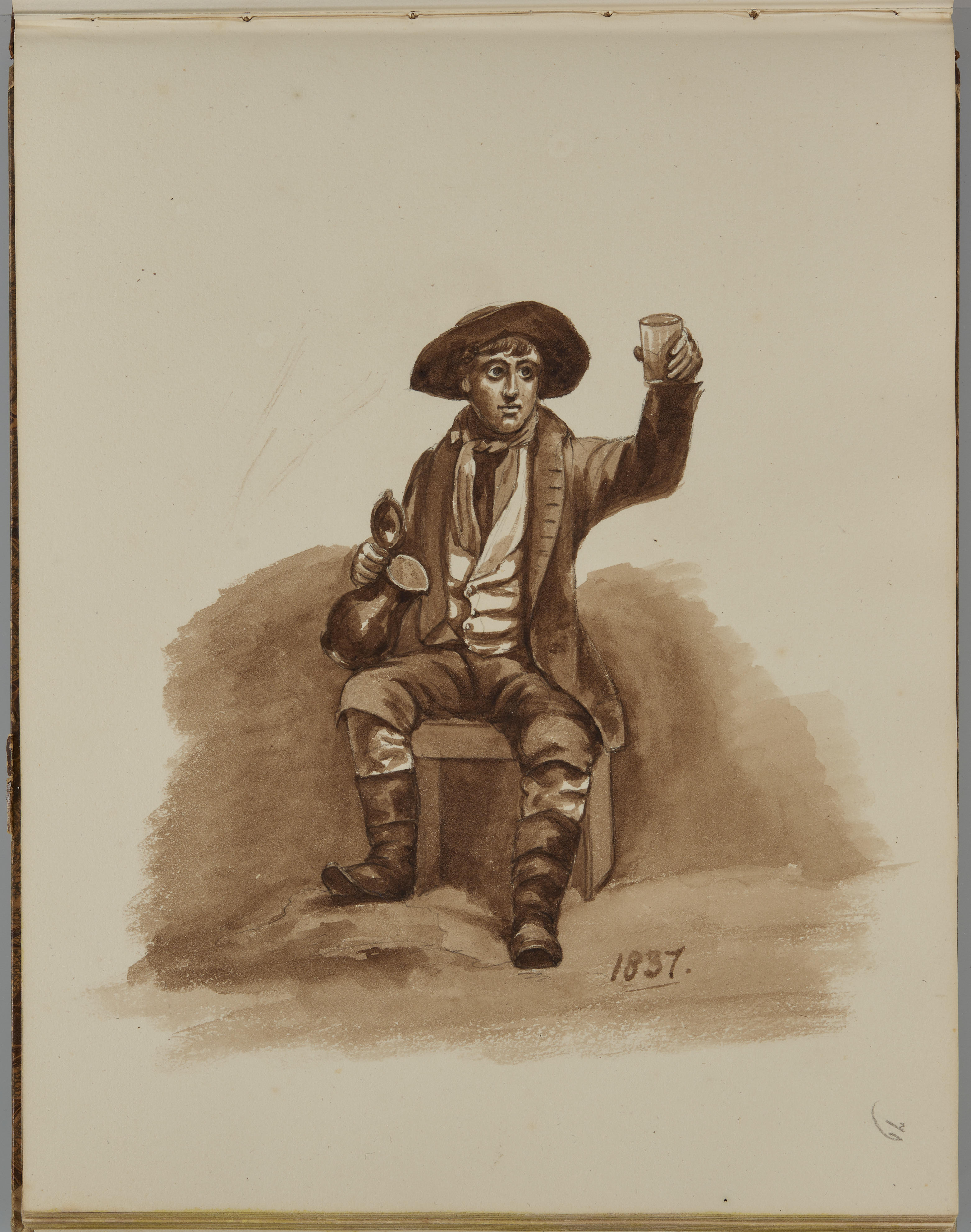 Sepiatekening van een man met een schenkkan en een drinkglas, afkomstig uit het schetsboek van J. Looyen (plaat 79).