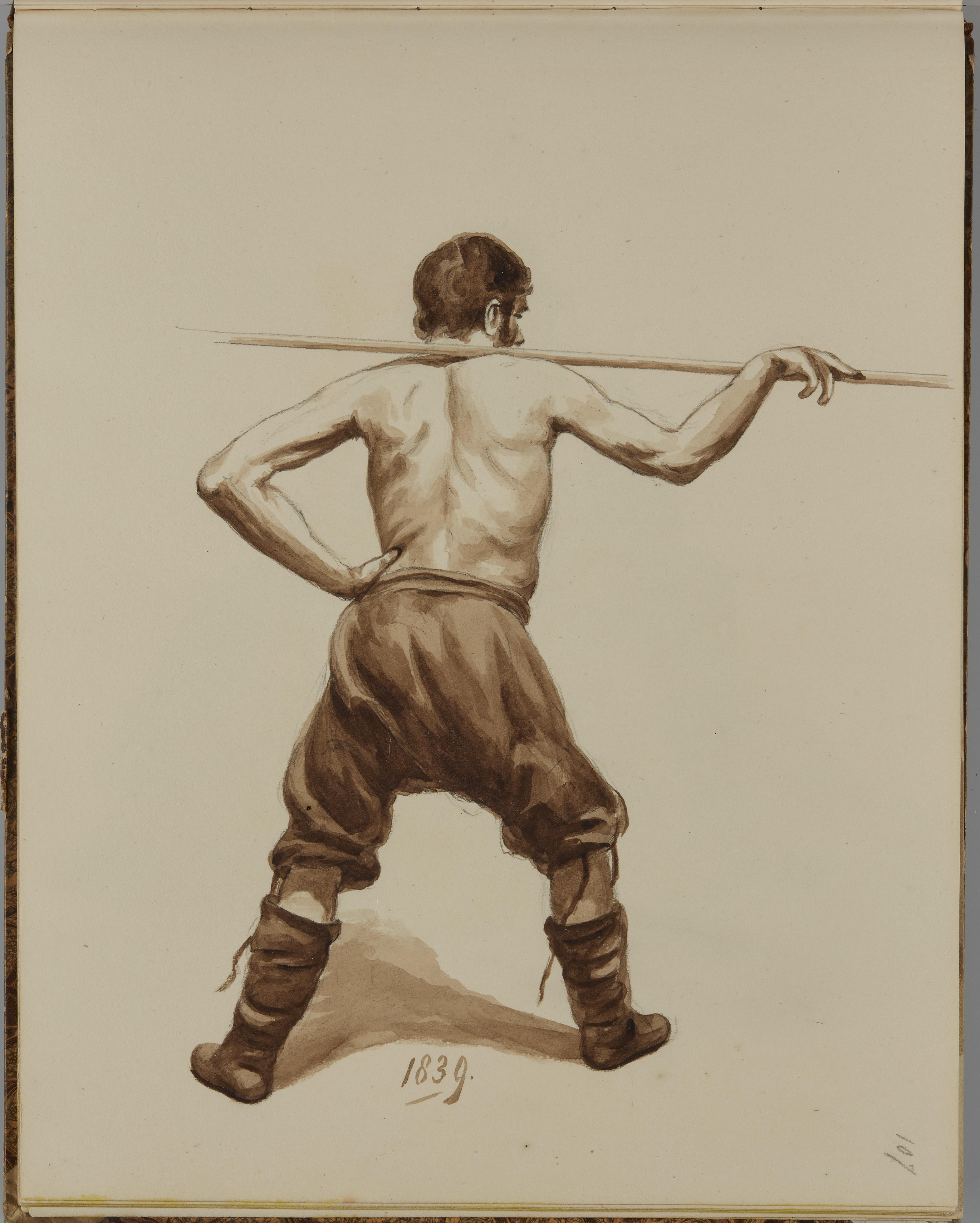Sepiatekening van een man met een ontbloot bovenlichaam en een stok op zijn schouders, afkomstig uit het schetsboek van J. Looyen (plaat 107).