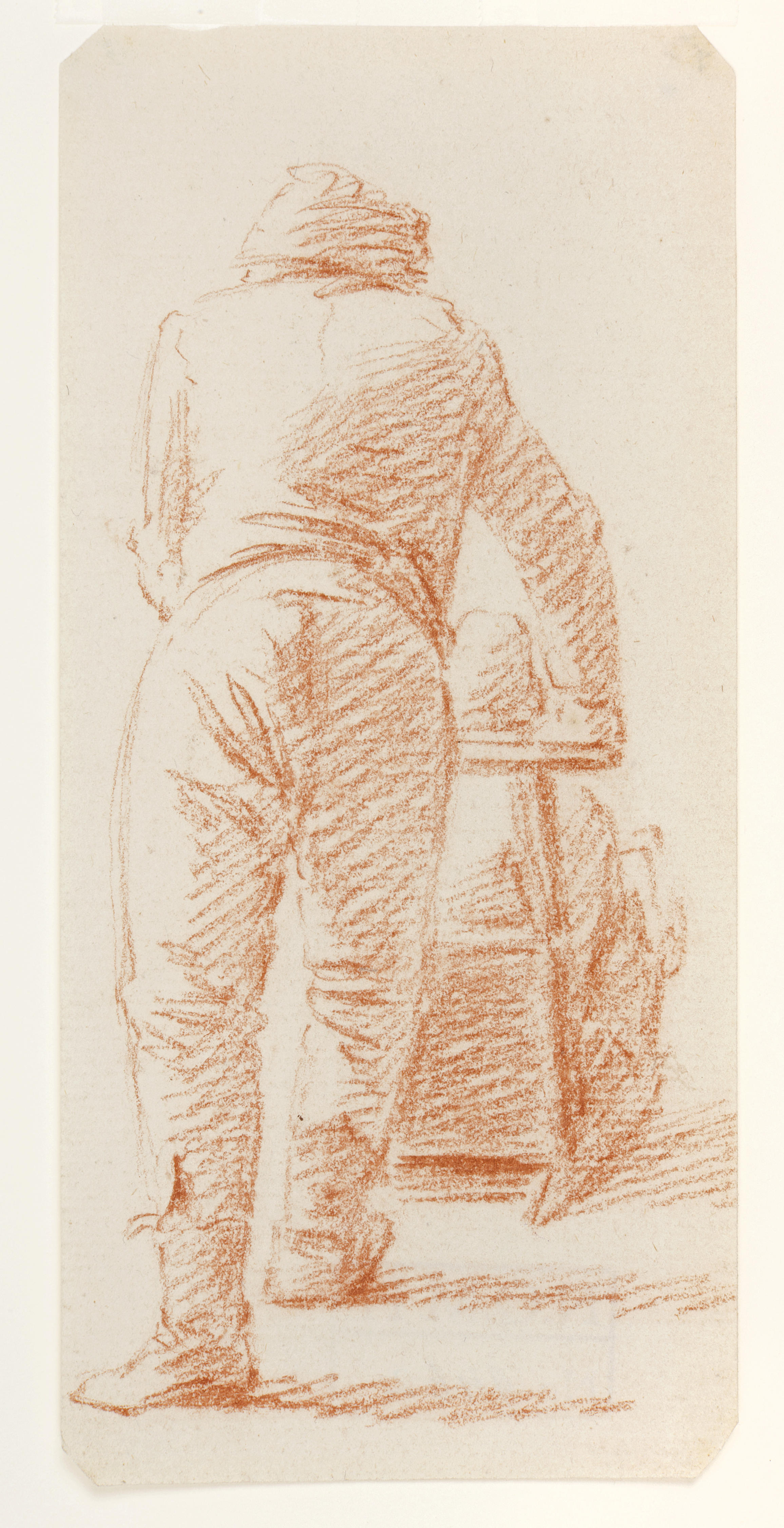 Krijttekening van een man die een slee voortduwt. De tekening is rond 1820 gemaakt door Hendrik van der Burgh (1769-1858).