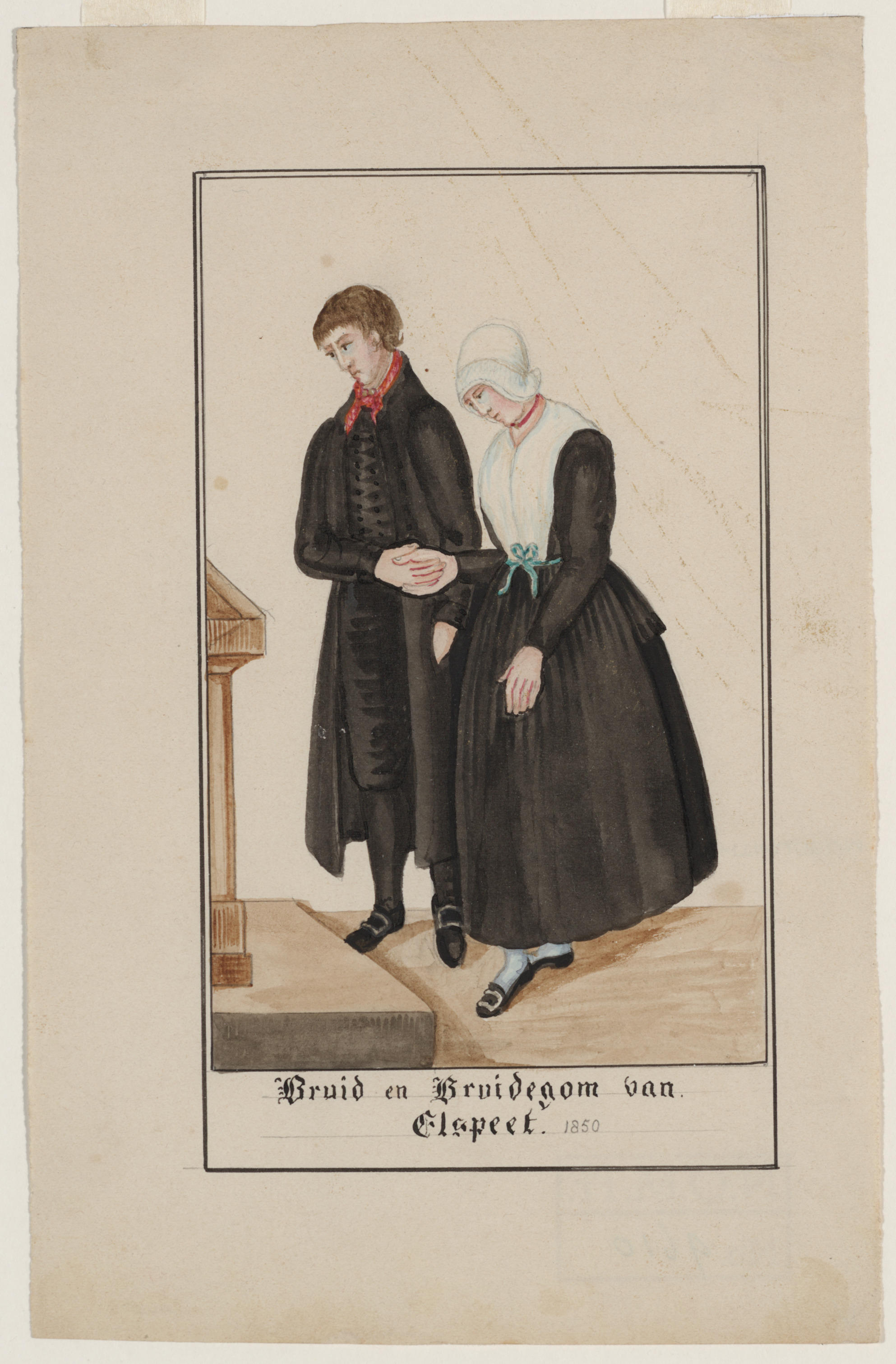 Volgens het onderschrift is hier een bruidspaar in de dracht van Elspeet rond 1850 afgebeeld. De kuitbroek en lange jas van de bruidegom zijn negentiende-eeuws van vorm en in de dagelijkse dracht dan al uit de mode. Ouderwetse kledingvormen blijven soms voor formele gelegenheden langer in gebruik. Bruiden dragen vaak een kostuum dat ingetogen en ...