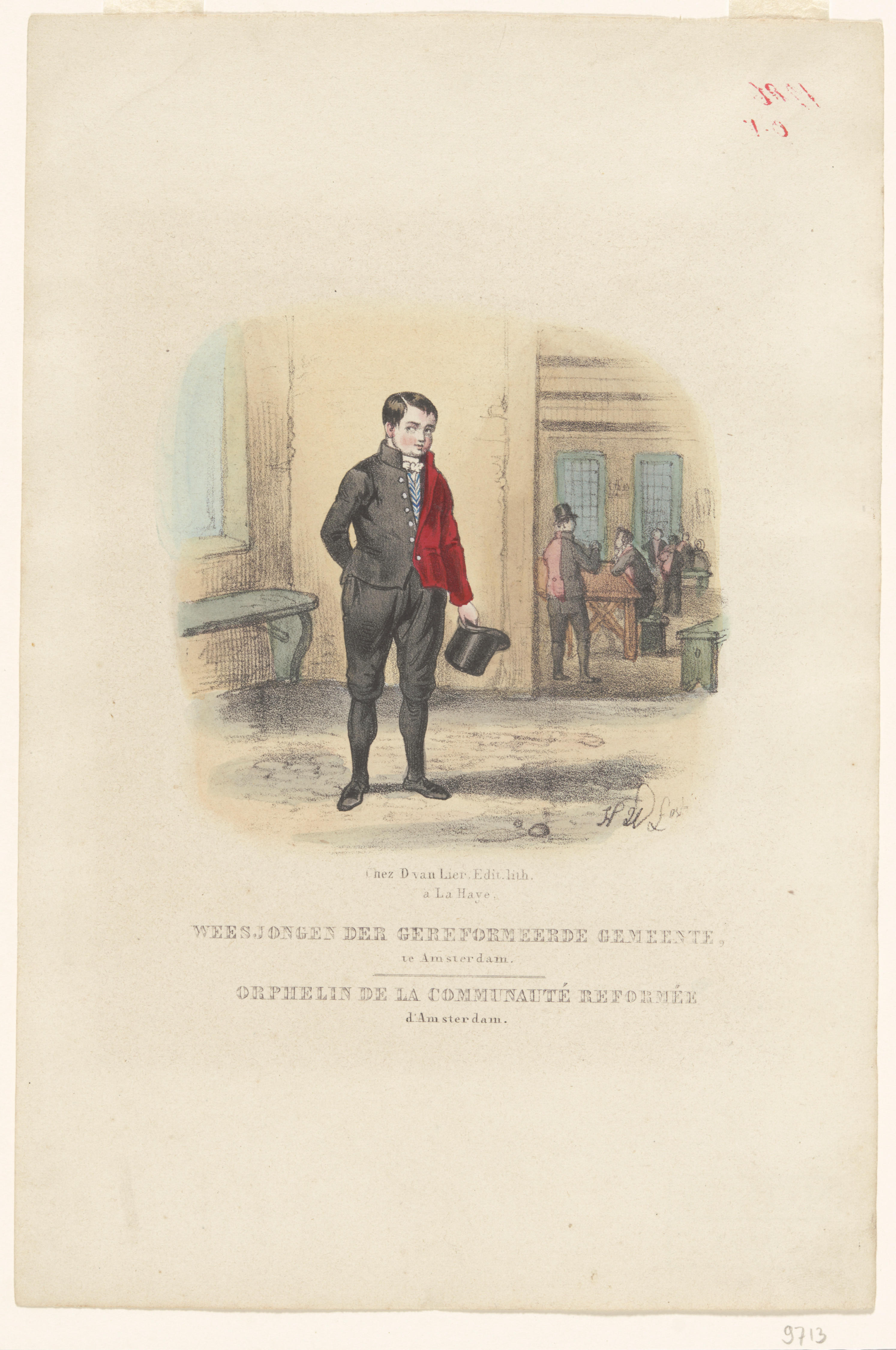 Prent van een gereformeerde weesjongen uit Amsterdam. De jongen is gekleed in een zwarte kuitbroek, zwarte kousen, en een half zwart/half rood jasje.