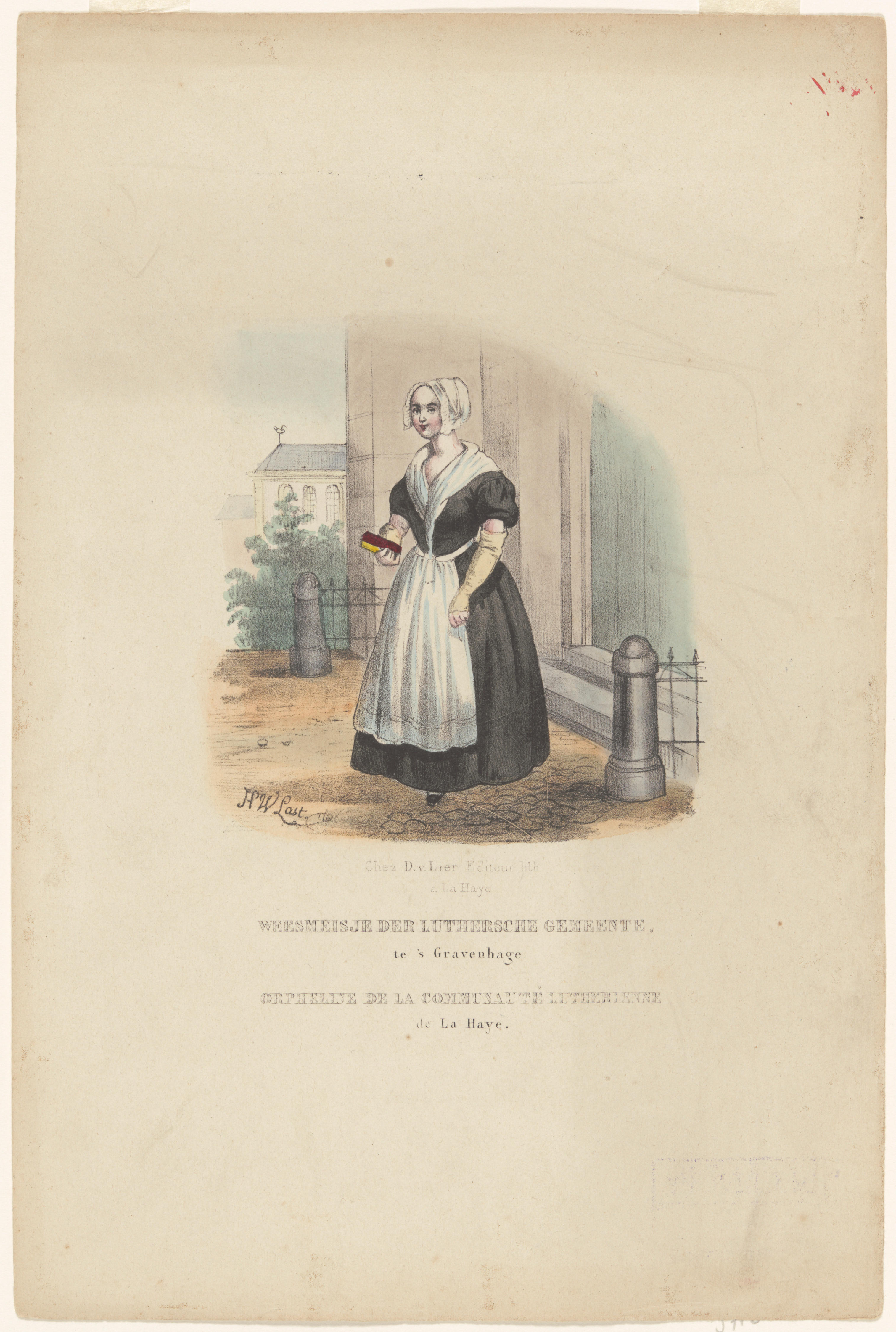 Prent van een luthers weesmeisje uit Den Haag. Het meisje is gekleed in een zwarte japon met een wit schort en een witte doek.