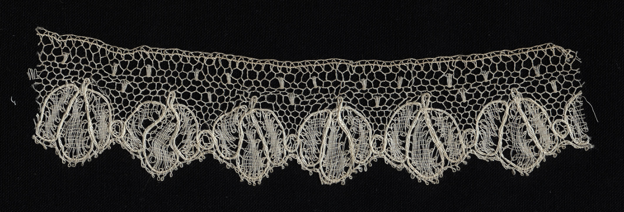 Stukje kloskant, in 1960 samen met een blauw zijden mutsenlint verworven van een boerin uit Axel. Het is een eenvoudige kloskant met een tulen grond. Tijdens het klossen zijn de spelden binnen de contourdraad van de motieven geplaatst, zoals dat ook bij Buckspoint gebeurt.