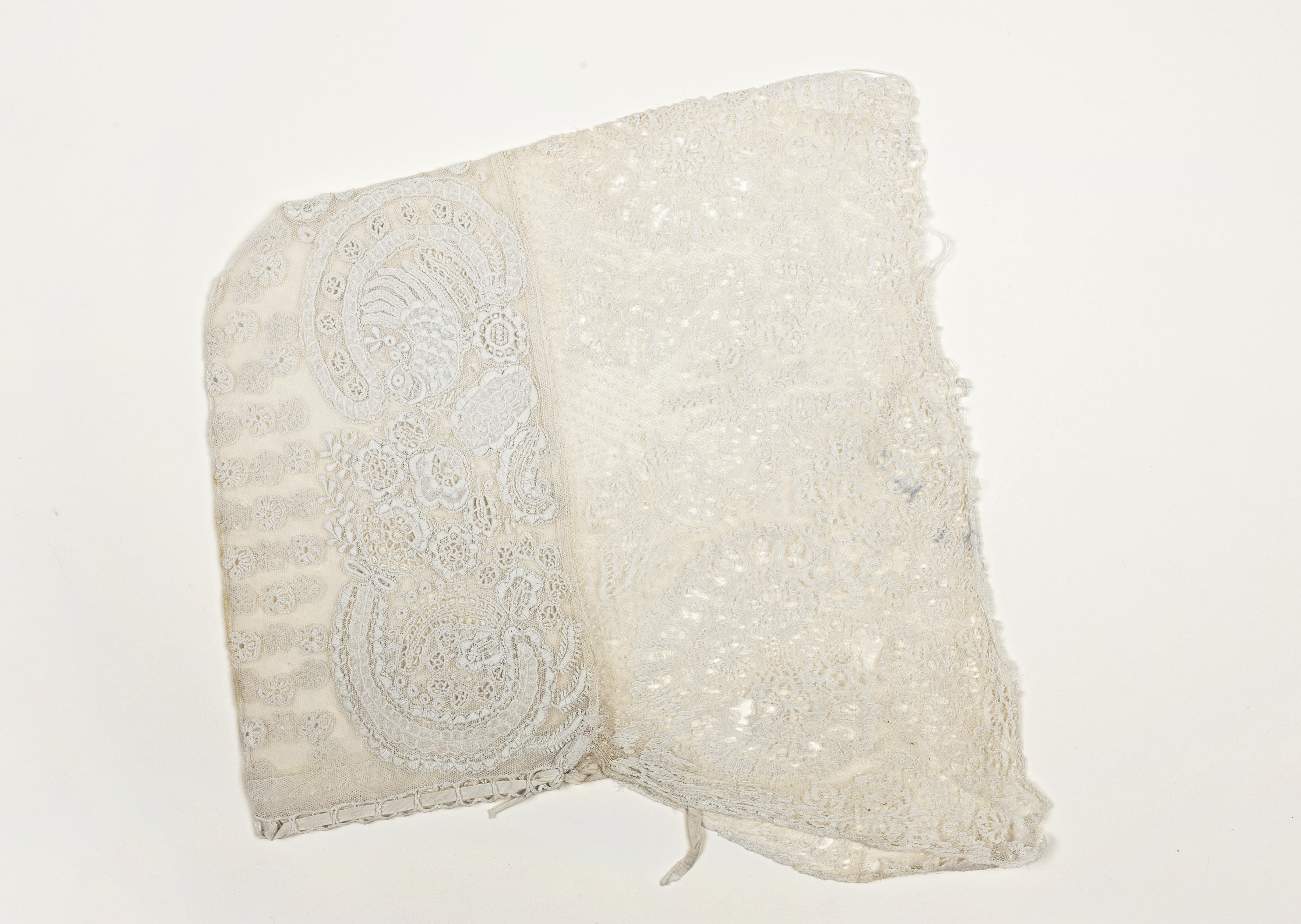 Tot stofstaal gedegradeerde hul uit Noordwijk. De bol is van doorgestopte tule. In de bol is een vogelmotief verwerkt en in de kantstrook een vlindermotief. De voorstrook is van Rijselse kloskant. De muts is niet opgemaakt.