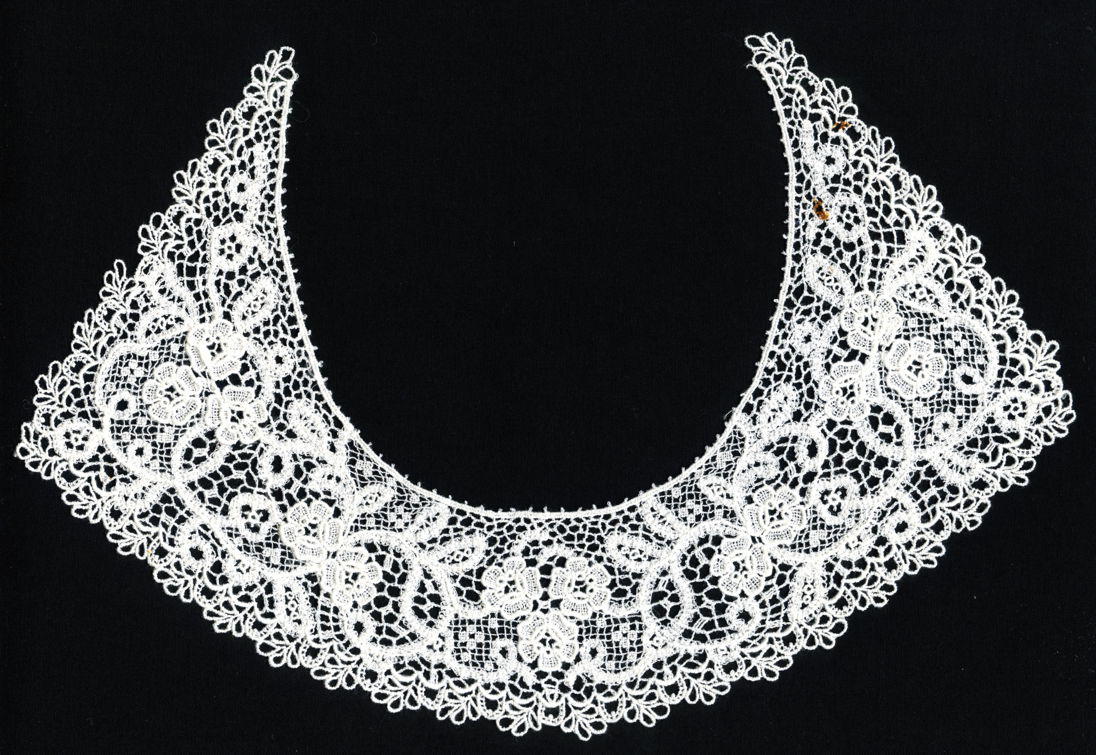 Kraagje of manchet van machinaal vervaardigde etskant. Bij de vervaardiging van etskant wordt het grondweefsel na het borduren van de motieven chemisch verwijderd.
