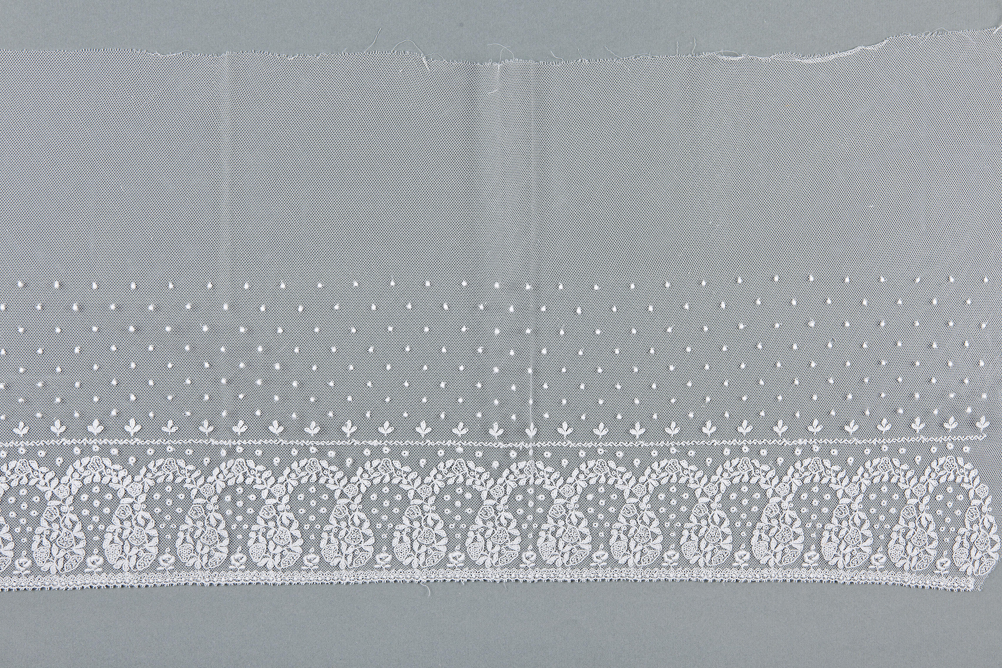 Strook machinaal geborduurde tule. Waarschijnlijk is dit een soort etskant. Bij etskant wordt over de tule een dunne stof gelegd waarop de motieven machinaal worden geborduurd. Vervolgens wordt deze dunne stof weggeëtst met een chemisch oplosmiddel, waarna de geborduurde tule over blijft.