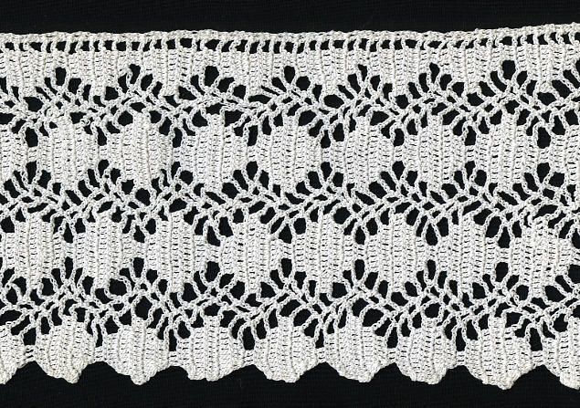 Gehaakte strook, in op- en neergaande richting gehaakt. De totale strook is circa 10,5 centimeter hoog en circa 2 meter lang.