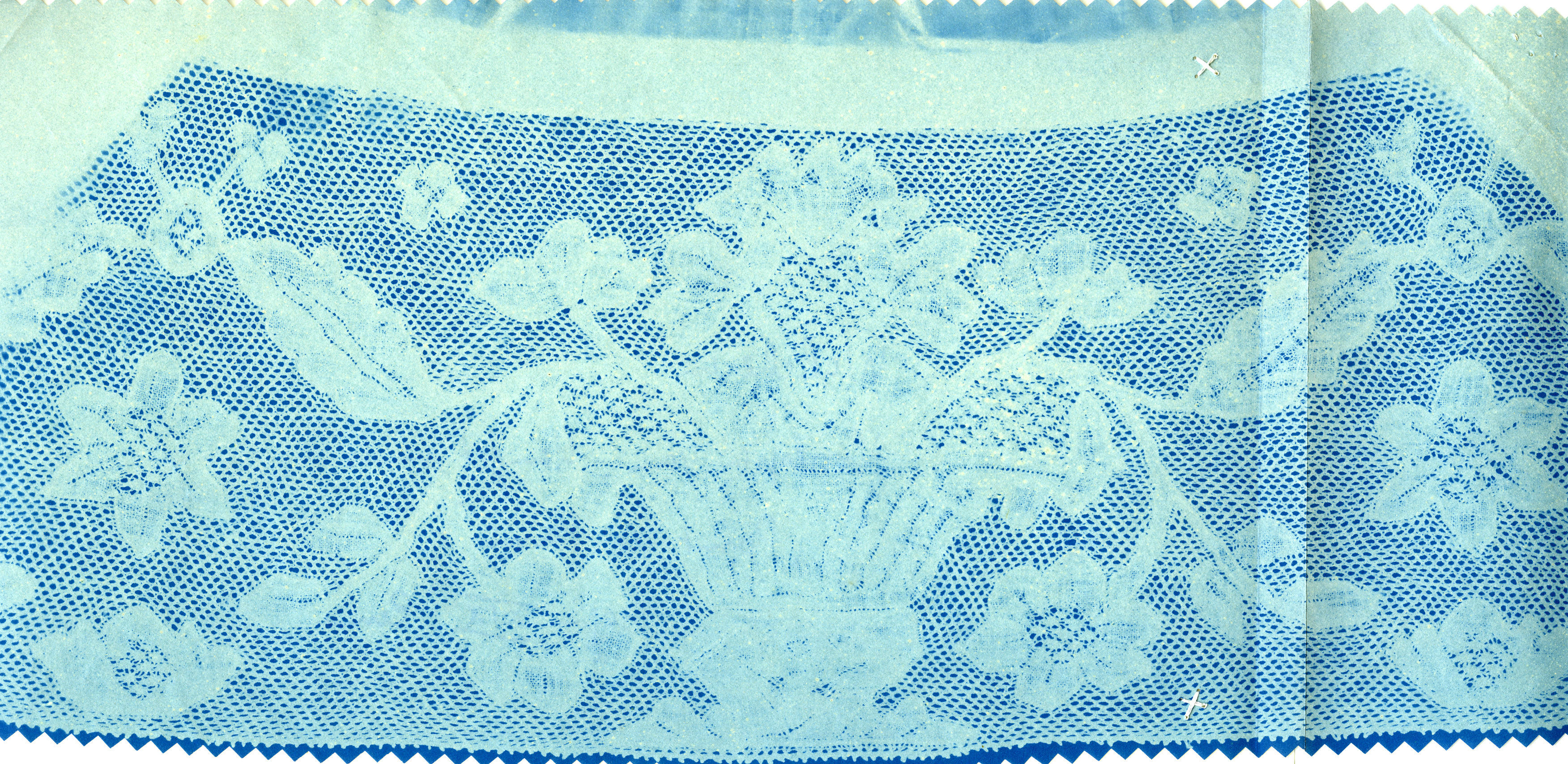 Een blauwdruk van een strook Parijse kant, gebruikt aan een negentiende-eeuwse Walcherse muts. De blauwdruk is vervaardigd door NOM-medewerkers tijdens veldwerk.