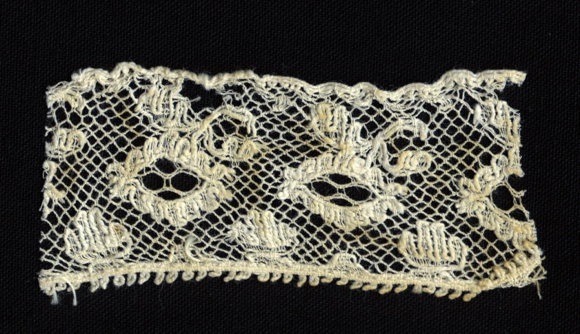 Strook machinale kant met een rapport van circa 2 centimeter. De kant is afkomstig van een 'toefmuts' (kornetmuts) uit Staphorst. Hij is gebruikt in de sterk geplooide voorstrook en werd bij gebrek aan kloskant ook wel aan de achterstrook gezet.