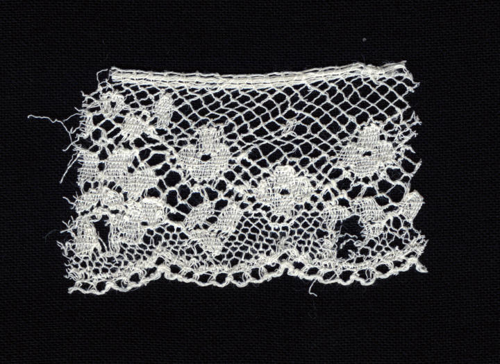 Strook machinale kant met een rapport van circa 4,5 centimeter. De kant is afkomstig van een 'toefmuts' (kornetmuts) uit Staphorst. Dit type machinale kant werd bij gebrek aan beter wel gebruikt in de sterk geplooide voorstrook, maar was eigenlijk te smal. Voor de achterstrook werd dit type niet gebruikt.