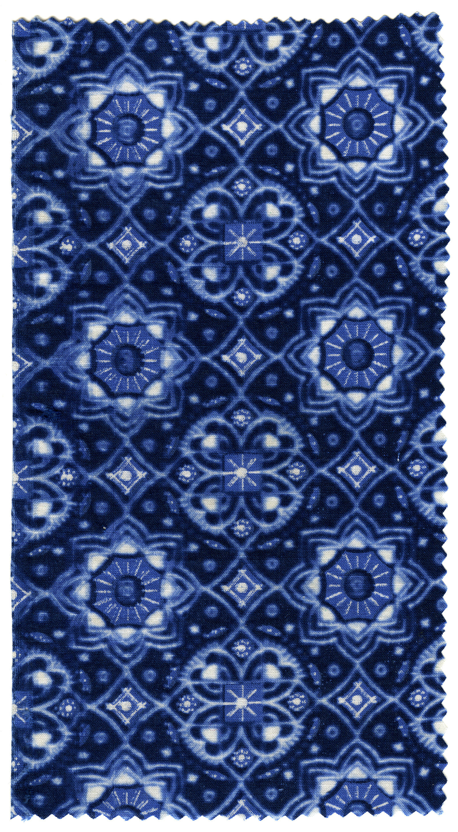 Katoenen stof, bedrukt met blauwe motieven. Deze stof werd in Staphorst aan de meter verkocht en gebruikt voor daagse zakdoeken. Er werden vierkante stukken uit de stof geknipt die vervolgens werden omgezoomd.