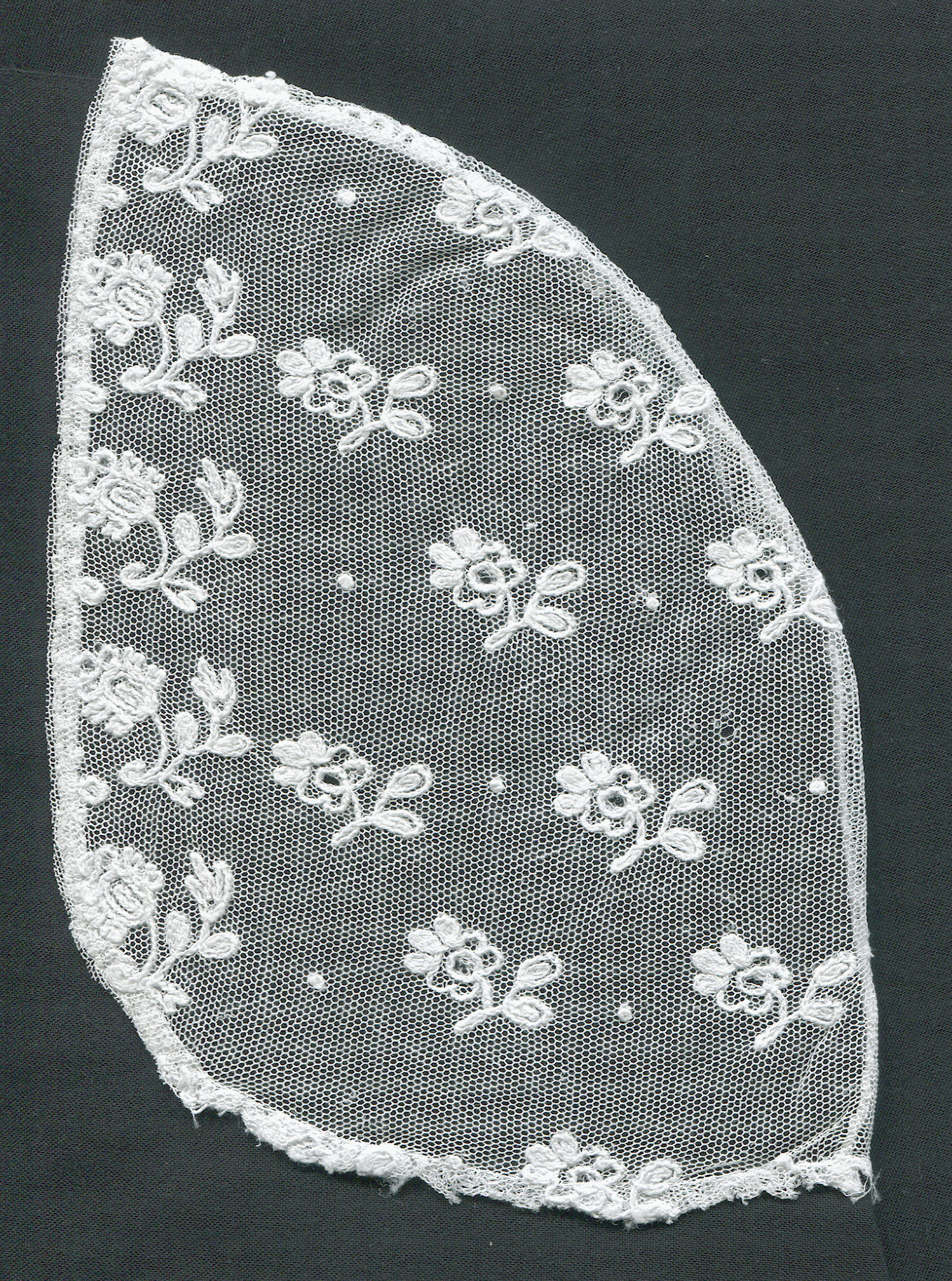 Bol van een floddermuts, vervaardigd van geborduurde tule en gedragen in Noord-Nederland.