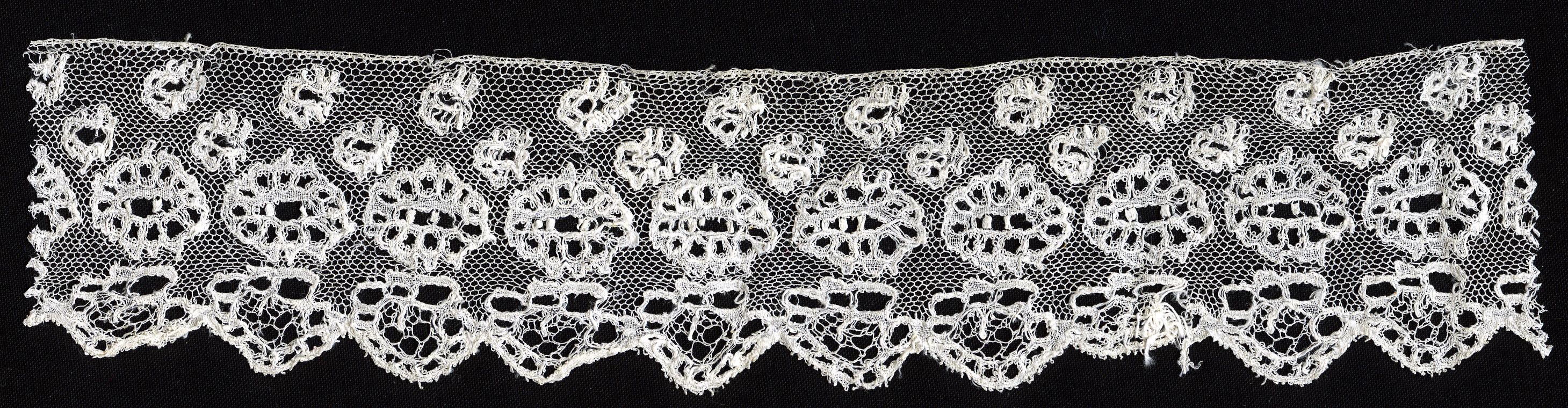 Stofstaal van Rijselse kloskant met schulprand. Rijselse kloskant met een geschulpte rand werd weinig toegepast aan de Nederlandse streekdrachtmutsen. Deze kant kwam onder meer voor aan kornetmutsjes uit de Alblasserwaard (als achterstrook) en een enkele keer aan kappen uit de Vechtstreek. Deze kant zou gebruikt kunnen zijn aan een vroege, katholieke Zuid-Bevelandse muts. Kanttechnisch noemt ...