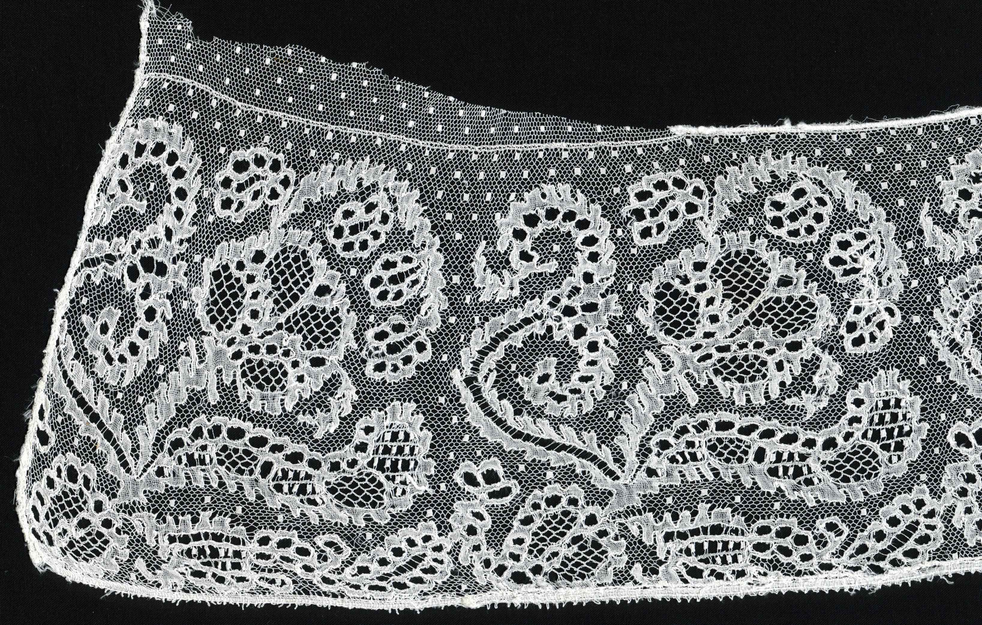 Voorstrook van een hul, gemaakt van Rijselse kloskant. Aan de uiteinden is nog een stukje machinale stiptule aanwezig waarmee de voorstrook verbreed was. In de motieven zijn verschillende siergronden toegepast, onder andere zogenaamde ‘leerkens’. De voorstrook is circa 66 centimeter lang en 18 centimeter breed. De gebruikte kantstrook is ongeveer 13,5 centimeter breed en heeft ...