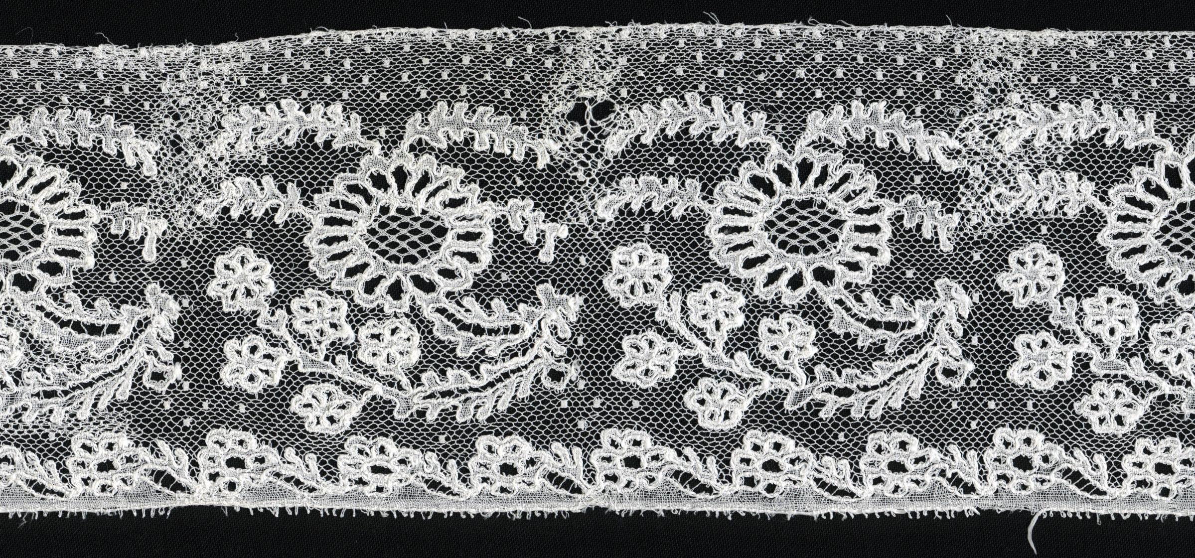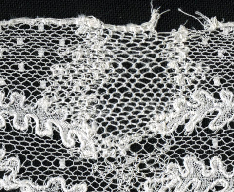 Strook Rijselse kloskant. De strook is waarschijnlijk afkomstig van een muts. Het is niet bekend waar de muts gedragen is, mogelijk in de Zaanstreek. In de bloemenharten is een siergrond toegepast. De kantstrook is circa 68 centimeter lang en circa 8 centimeter breed. Het rapport is circa 7 centimeter. De kant is sleets en is ...