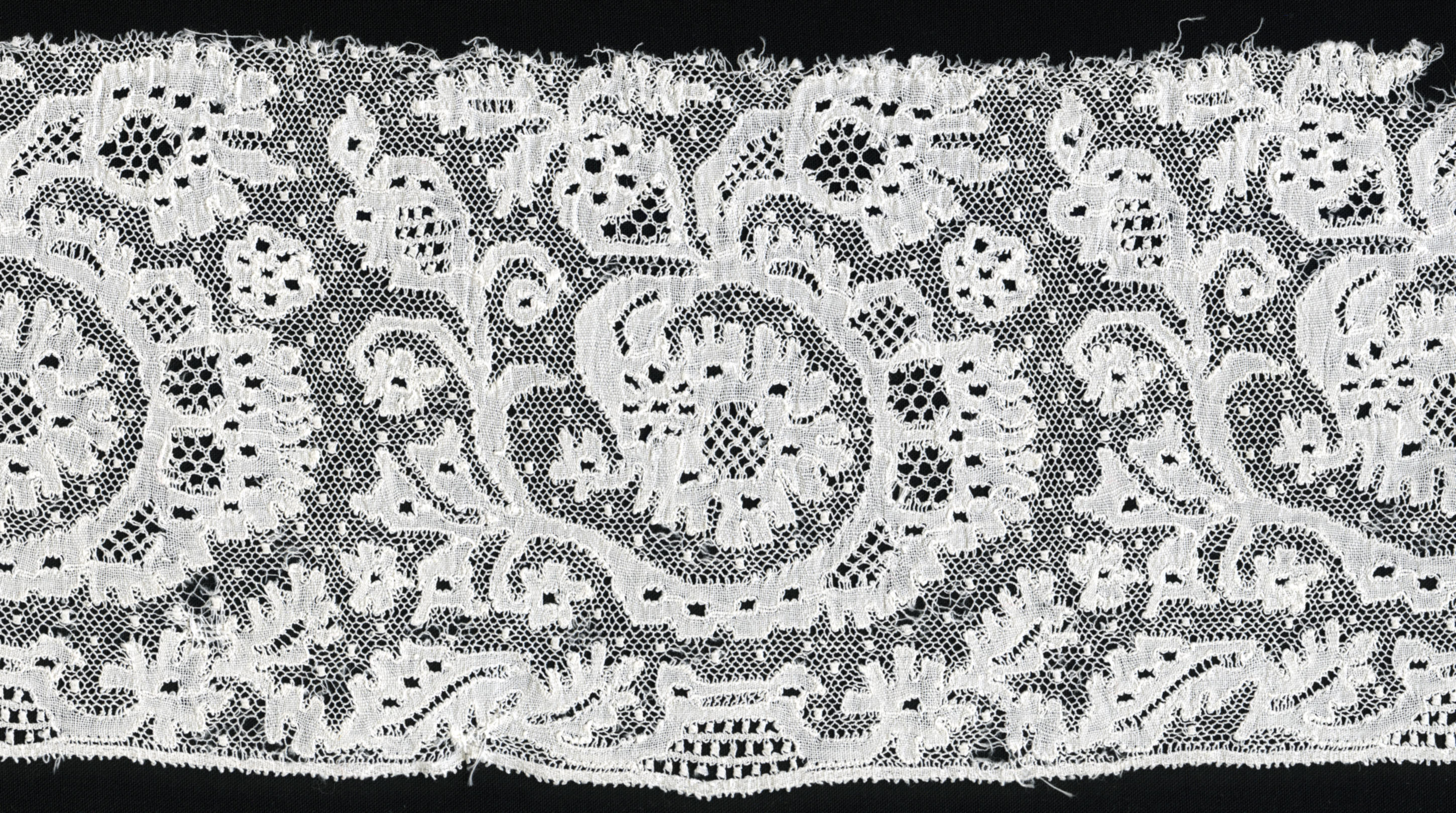 Strook Rijselse kloskant, afkomstig van een Zuid-Bevelandse muts. In de motieven zijn verschillende siergronden toegepast, onder meer zogenaamde 'rozengrond' en ‘leerkens’. De strook is aan één eind gezoomd. De kantstrook is circa 36 centimeter lang en circa 13 centimeter breed. Het rapport is circa 12 centimeter. De zelfkant aan de bovenzijde ontbreekt. De kant is ...