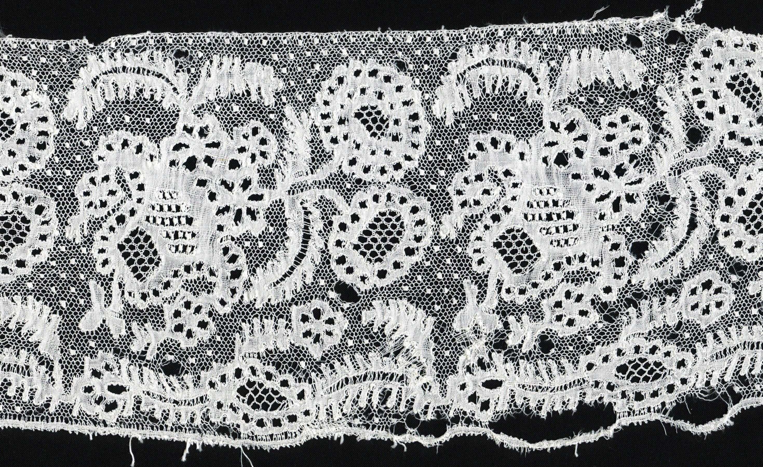 Strook Rijselse kloskant, gebruikt aan een Zuid-Bevelandse muts. In de motieven zijn verschillende siergronden toegepast, onder meer zogenaamde ‘rozengrond’ en ‘leerkens’. De kantstrook is circa 30 centimeter lang en circa 13 centimeter breed. Het rapport is circa 12,5 centimeter. De kant is hier en daar sleets.