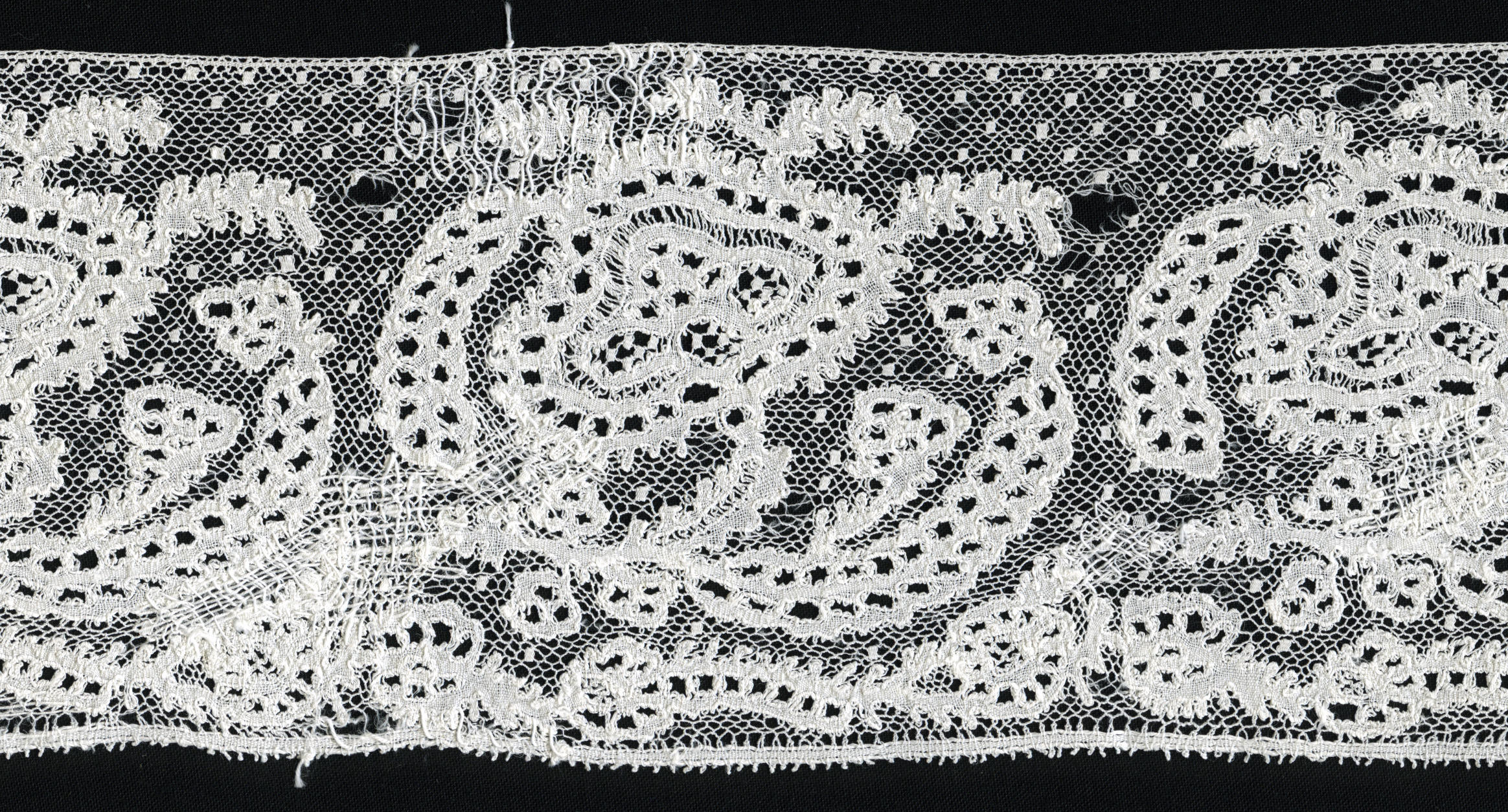 Strook Rijselse kloskant, gebruikt als 'reep' aan een Zuid-Bevelandse muts. De zogeheten reep is een onderdeel van de Zuid-Bevelandse vrouwenmuts. Aan de 'achtermuts' van effen batist of fijne katoen worden drie kantstroken gezet, achtereenvolgens de 'pluumkant', de 'reep' en de 'punt'. In de motieven is een siergrond toegepast. De strook is aan beide uiteinden gezoomd. ...