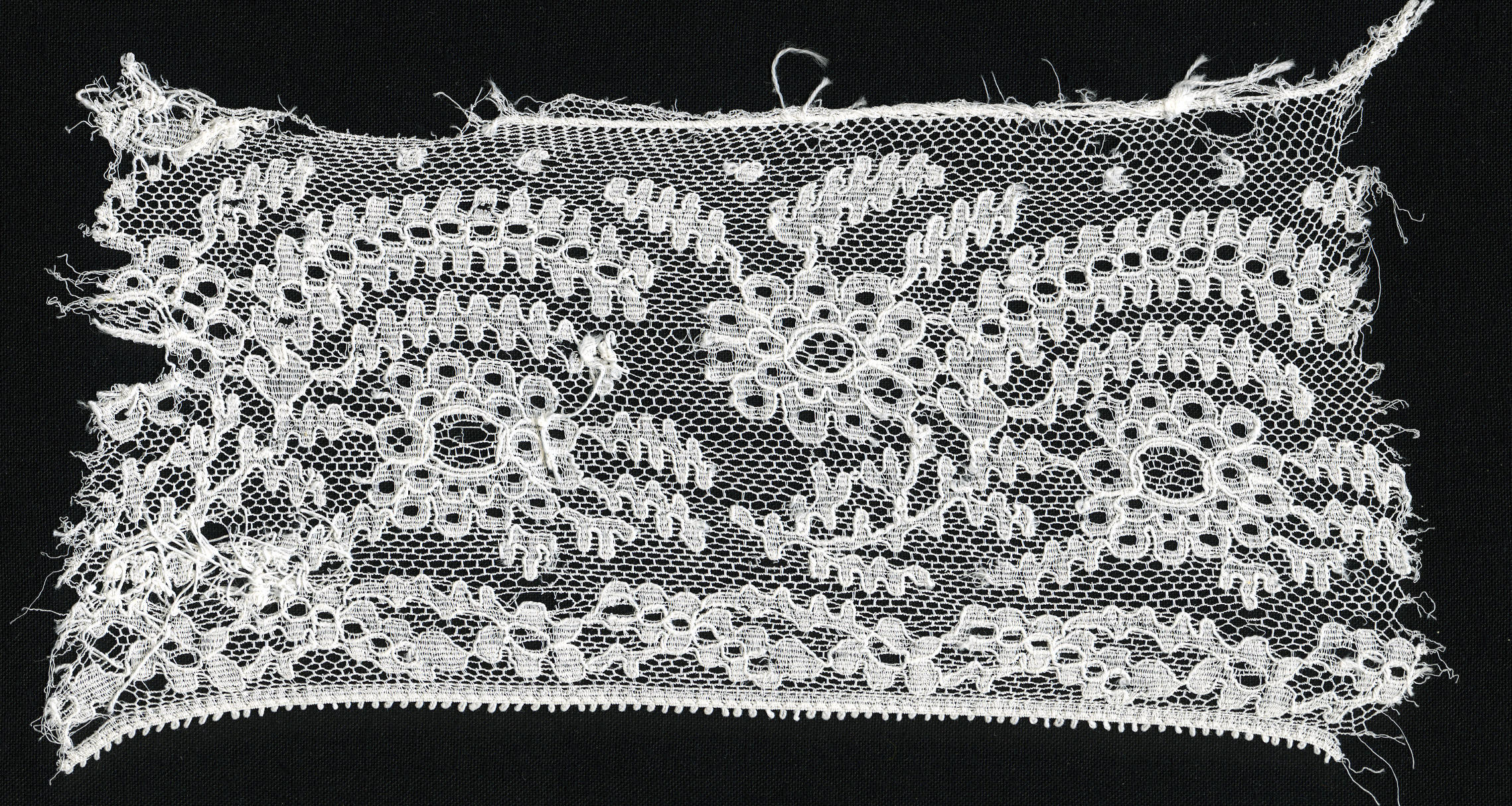 Strook machinale kant. De strook is waarschijnlijk afkomstig van een muts. Het is niet bekend in welke streek de muts gedragen is. Dit type kant werd onder meer gebruikt als achterstrook aan 'knipmutsen' in Oost-Nederland, als voorstrook aan diverse hullen waaronder de hul van Urk en aan de verschillende typen mutsen die gedragen werden in ...