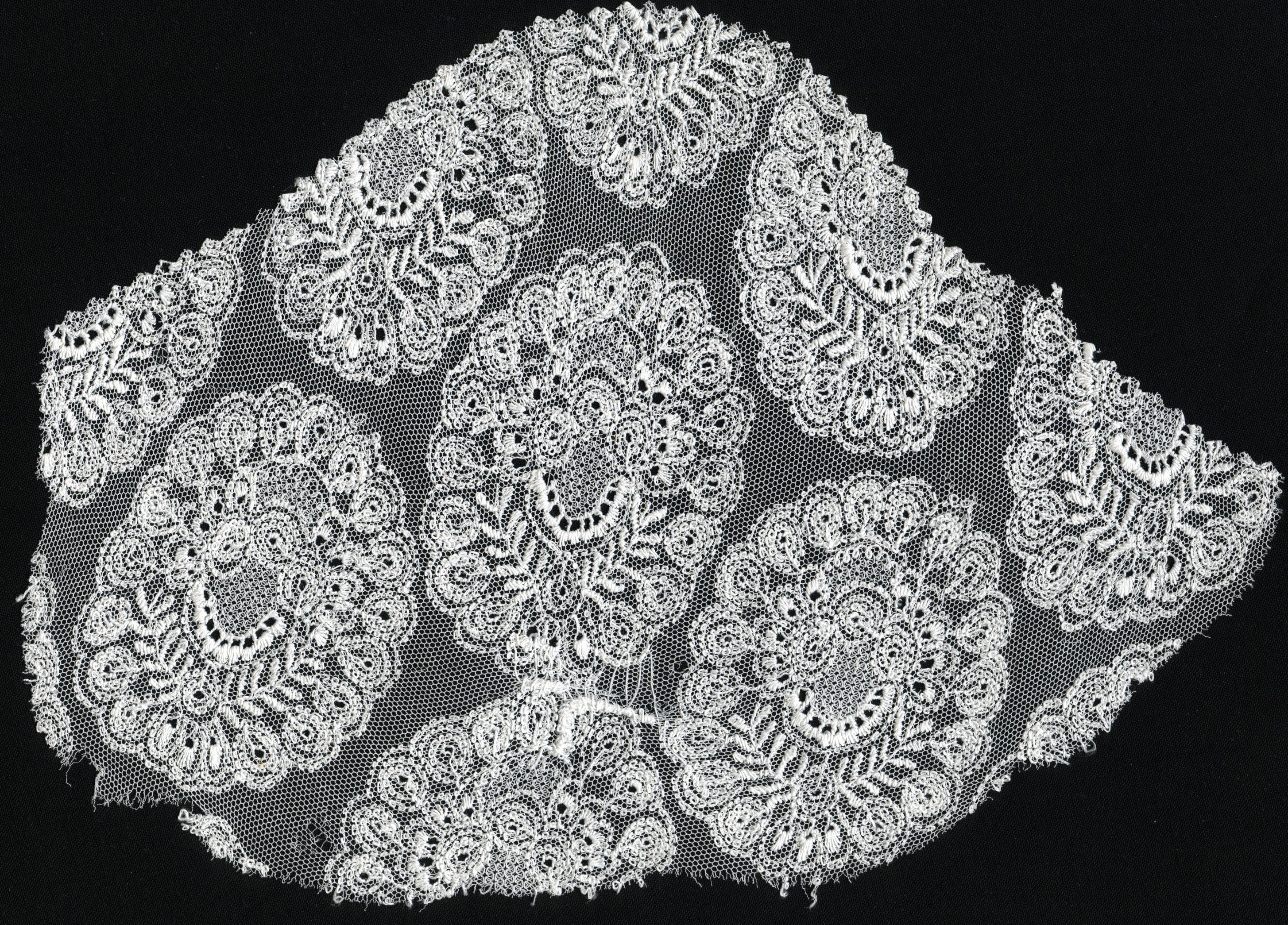 Fragment van met de hand geborduurde tule, afkomstig uit de bol van een knipmuts (kornetmuts). Het is niet bekend in welke plaats de knipmuts is gedragen. De ovale motieven zijn circa 8 bij 6 centimeter.