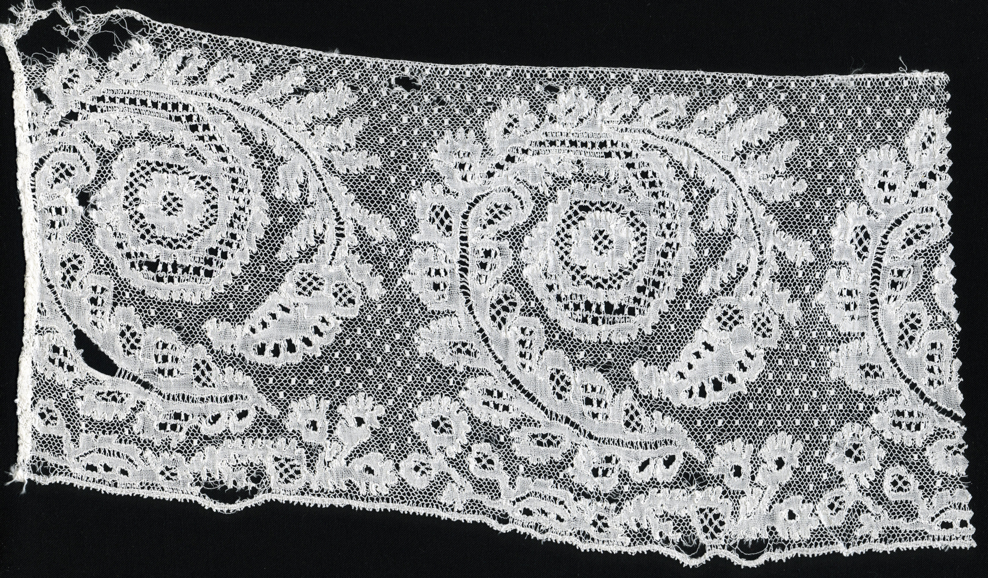 Strook Rijselse kloskant. In de motieven komen verschillende siergronden voor. De kant heeft een rapport van circa 12,5 centimeter.