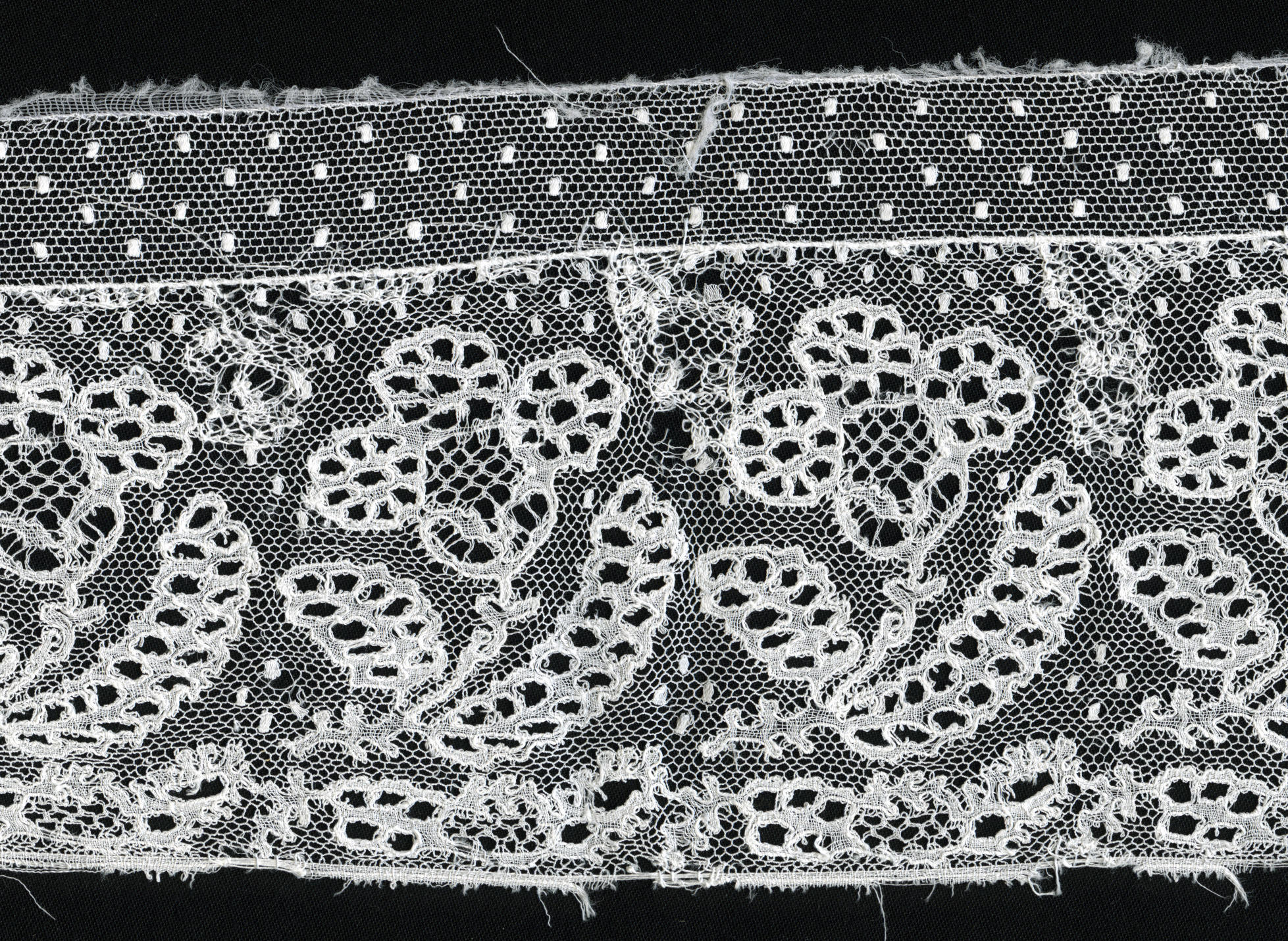 Achterstrook van een West-Friese muts, vervaardigd van Rijselse kloskant. De kant is circa 8 centimeter breed en is aan de bovenzijde verbreed met een strook stiptule. Langs de bovenrand van de stiptule zijn hier en daar nog resten van het zijden gaas van de mutsenbol te zien. Aan de beide uiteinden is een stukje effen ...