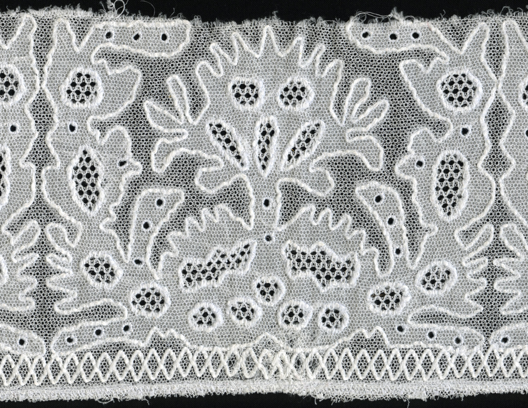 Pluumkant van geborduurde tule. De pluumkant bestaat uit twee lagen tule met daartussen motieven van een fijne witte stof. Rondom de motieven is met een dikke draad een contourlijn geborduurd. Op verschillende plaatsen zijn openingen gemaakt die zijn opgevuld met siersteken. De zogeheten pluumkant is een onderdeel van de Zuid-Bevelandse vrouwenmuts. Aan de 'achtermuts' van ...