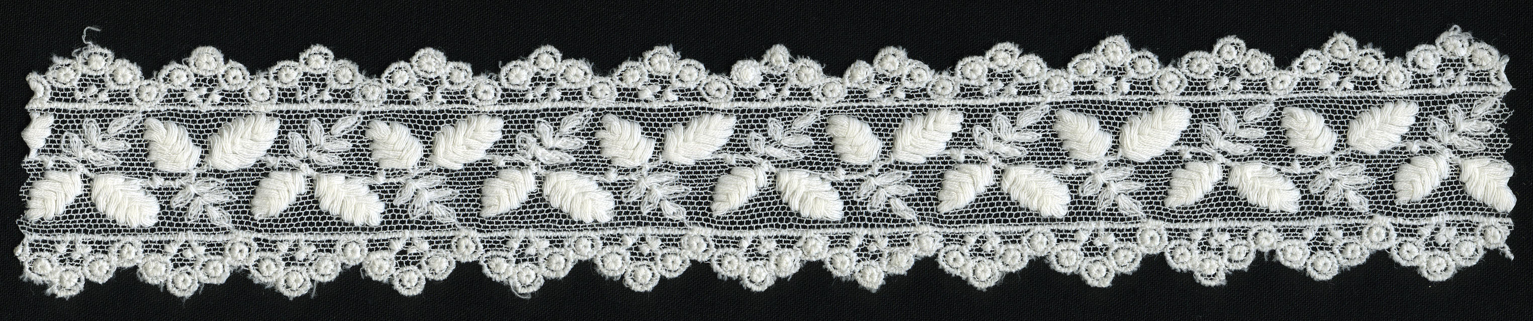 Fragment van een stuk machinaal versierde tule. Waarschijnlijk is er eerst een dunne stof over de tule gespannen waarop de motieven machinaal zijn geborduurd. Na het borduren is de stof weggeëtst.