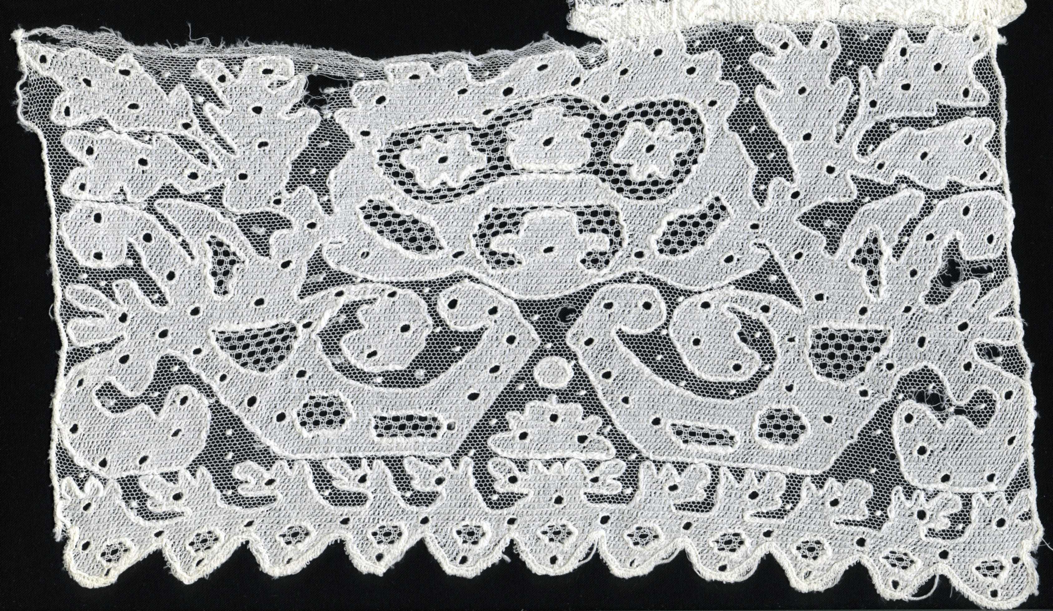 Gedeelte van een katholieke Zuid-Bevelandse muts, vervaardigd van versierde tule, zogenoemde 'plankjeskant'. Het gedeelte bestaat uit een kant en een punt met aan beide zijden een onderkant. De katholieke Zuid-Bevelandse vrouwenmuts bestaat uit verschillende onderdelen. Aan de 'achtermuts' van effen batist of fijne katoen worden drie kantstroken gezet, achtereenvolgens de 'pluumkant', de 'reep' of 'kant' ...