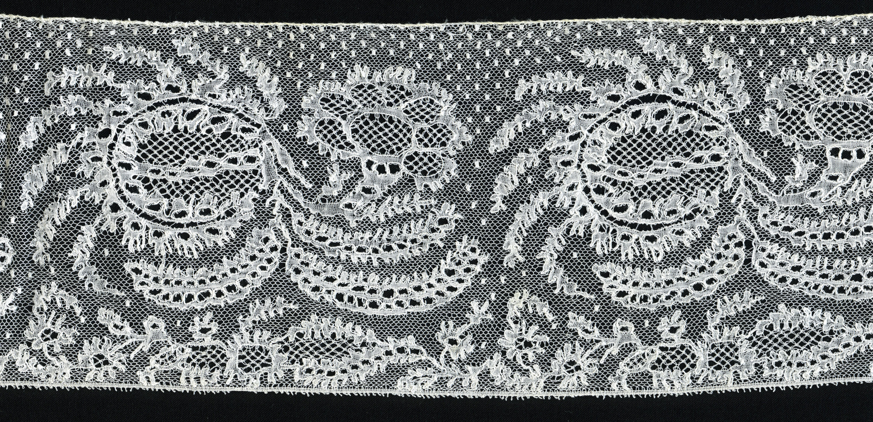 Achterstrook van een West-Friese kap. De strook is van Rijselse kloskant. In de bloemharten is een siergrond toegepast. De kant is 10,5 centimeter breed. Het rapport is circa 14 centimeter. De totale lengte van de achterstrook is 146 centimeter.