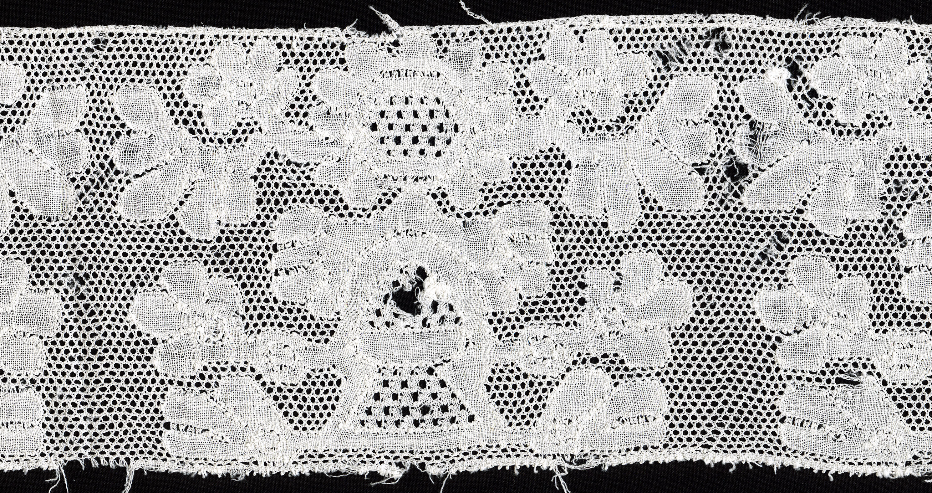 Zogenaamde ‘pluumkant’, afkomstig van een Zuid-Bevelandse muts. De Zuid-Bevelandse vrouwenmuts bestaat uit verschillende onderdelen. Aan de 'achtermuts' van effen batist of fijne katoen worden drie kantstroken gezet, achtereenvolgens de 'pluumkant', de 'reep' of 'kant' en de 'punt'. De kloskant heeft een Parijse grond. In de motieven is een siergrond toegepast. Het rapport is circa 17 ...