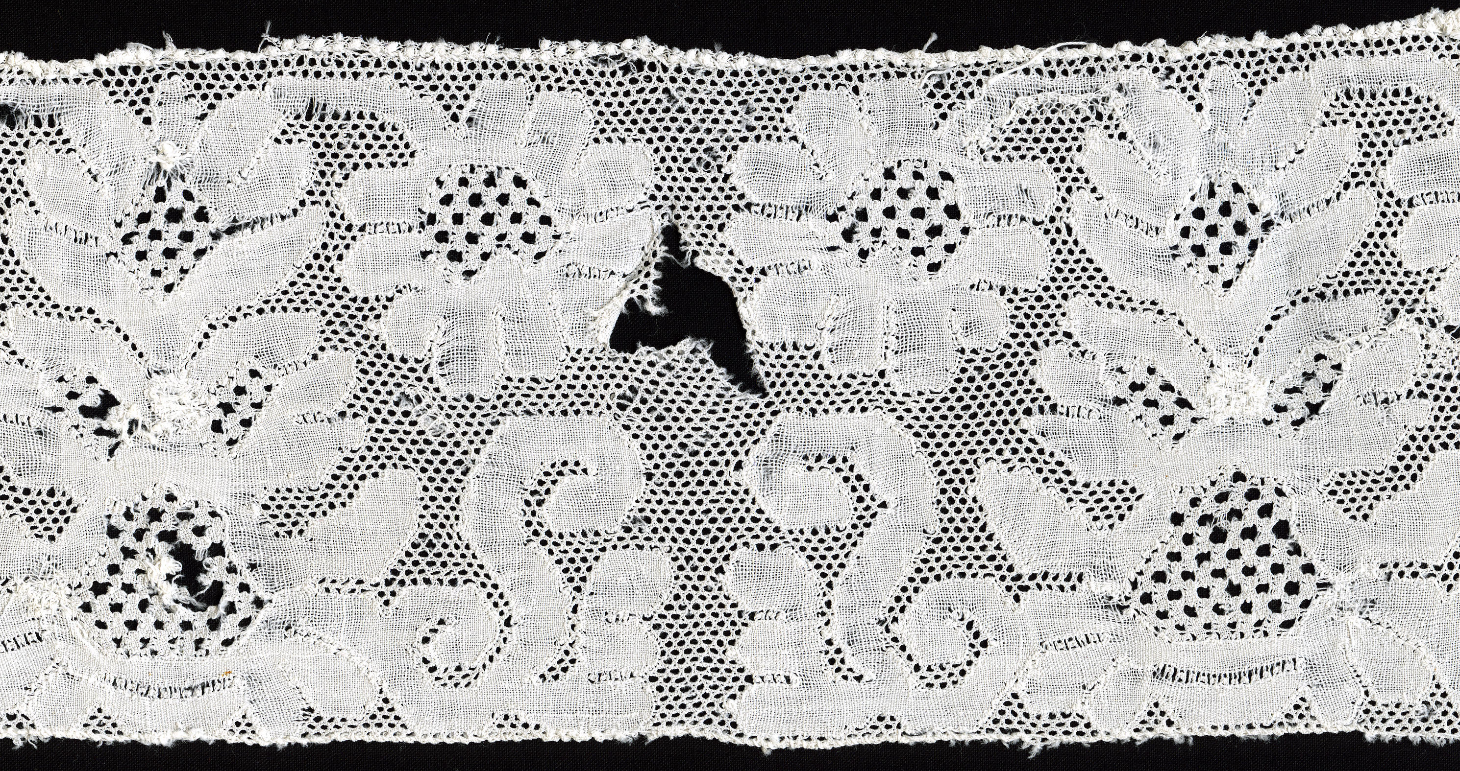 Fragment van een zogenaamde ‘pluumkant’, afkomstig van een Zuid-Bevelandse muts. De Zuid-Bevelandse vrouwenmuts bestaat uit verschillende onderdelen. Aan de 'achtermuts' van effen batist of fijne katoen worden drie kantstroken gezet, achtereenvolgens de 'pluumkant', de 'reep' of 'kant' en de 'punt'. De kloskant heeft een Parijse grond. In de motieven is een siergrond toegepast. Het rapport ...