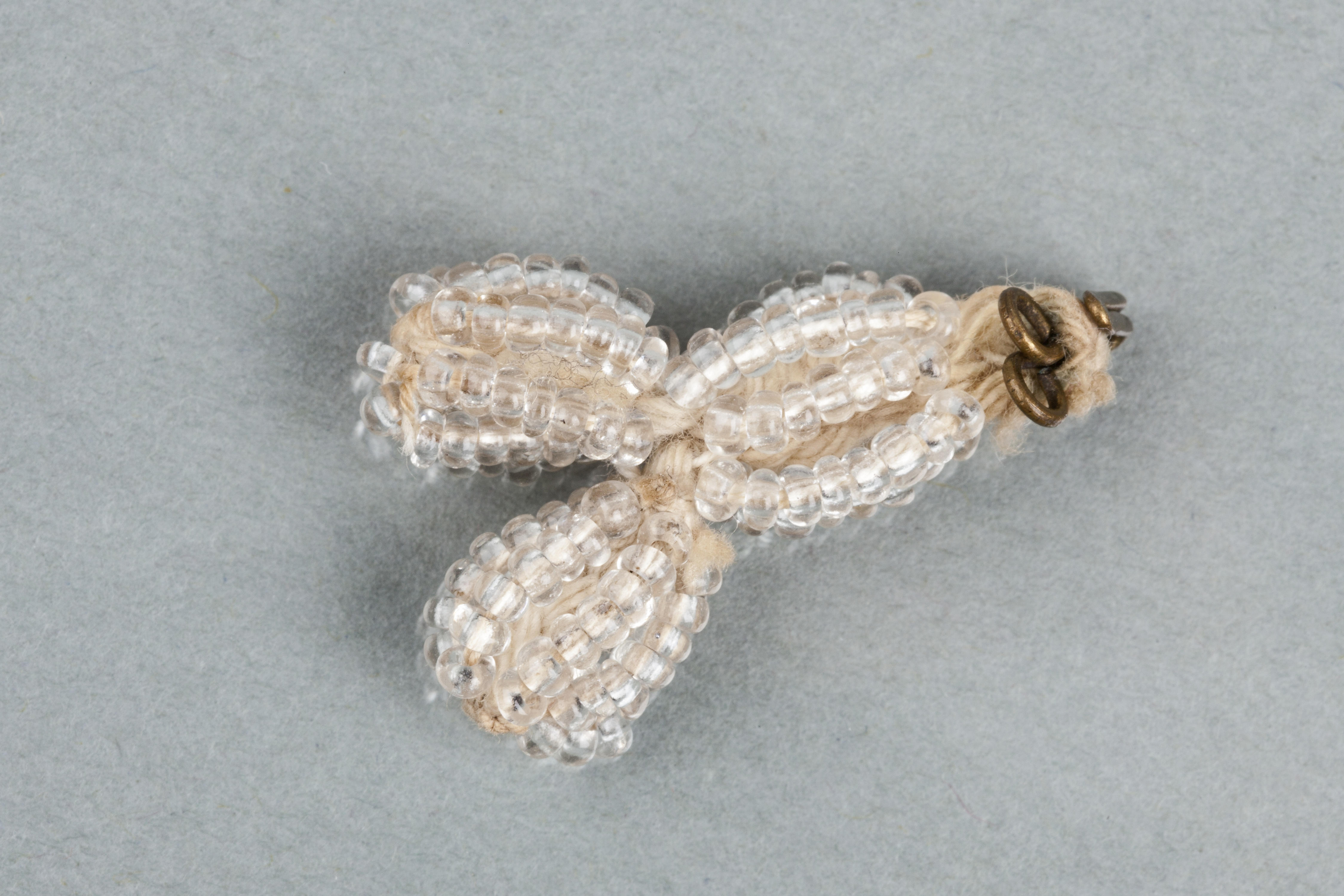 Kralenakertje van crèmekleurige katoenen garen met doorzichtige glazen kralen, afkomstig van Marken. Aan de bovenzijde is in het akertje een messing haak gestoken waarmee het aan de schouderdoek bevestigd kan worden.