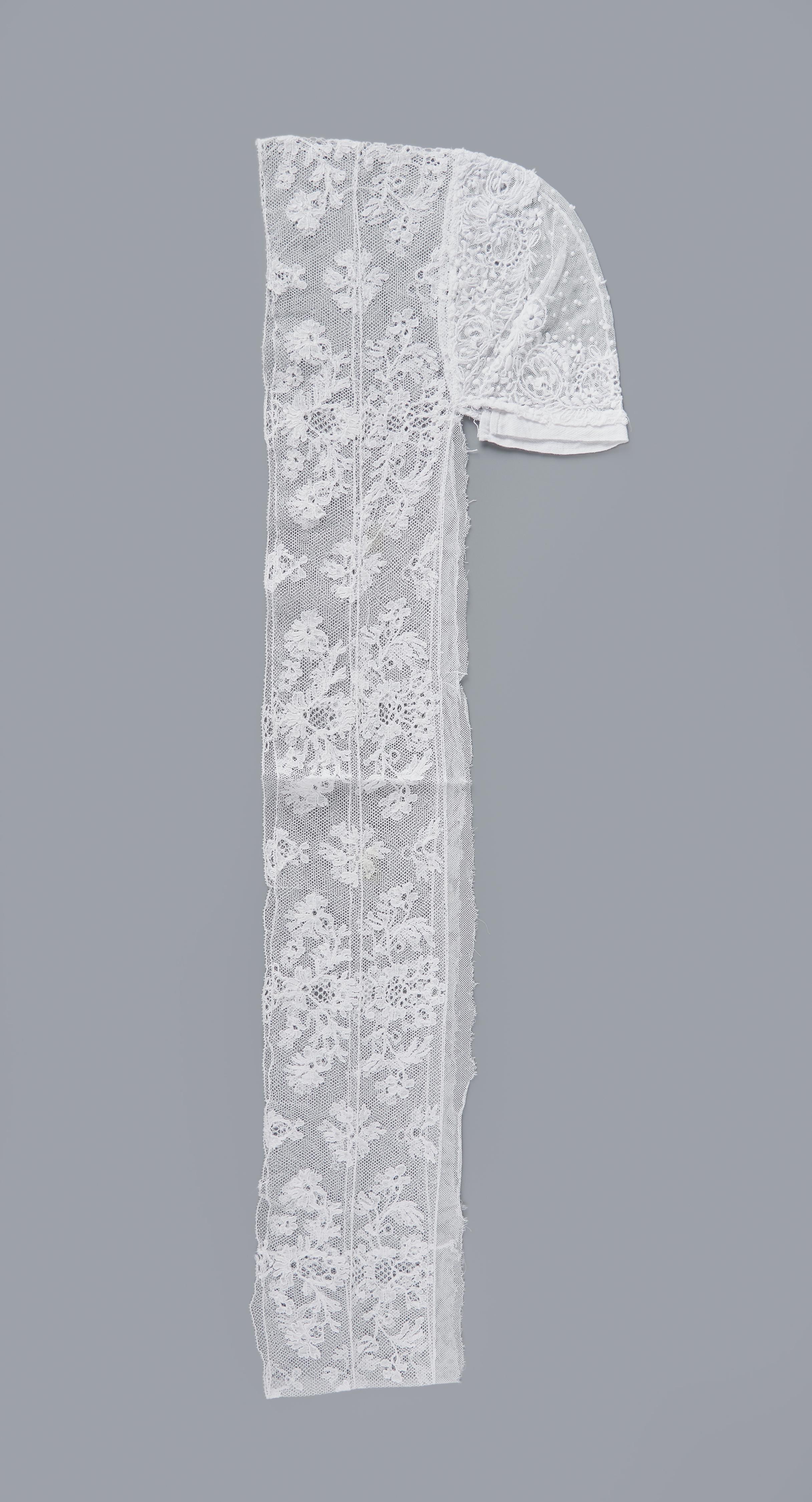 Losgetornde Drentse floddermuts. De bol is van versierde tule. De kantstrook bestaat uit twee stroken Rijselse kloskant van ieder circa 5 centimeter breed. Hieraan is een strook tule van circa 1,5 centimeter breed gezet. De kloskanten hebben beide een rapport van circa 17 centimeter. In de beide kloskanten is een siergrond toegepast. De totale wijdte ...