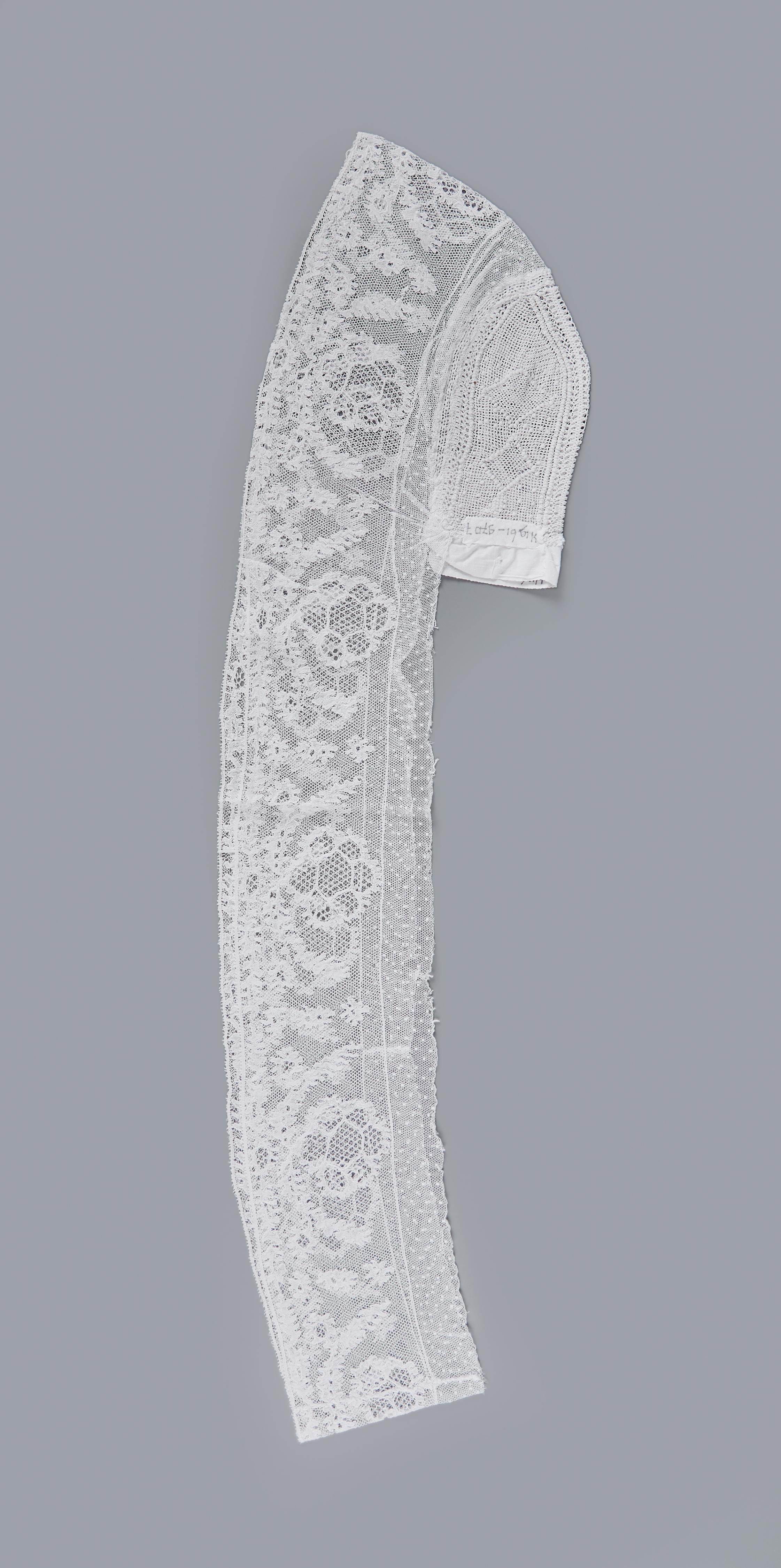 Losgetornde Drentse floddermuts. De bol is gehaakt. De kantstrook bestaat uit een strook Rijselse kloskant van circa 10 centimeter breed. Hieraan is een strook machinale stiptule van circa 2 centimeter breed gezet. De kloskant heeft een rapport van circa 16,5 centimeter. In de kant is een siergrond toegepast. De totale wijdte van de kantstrook is ...