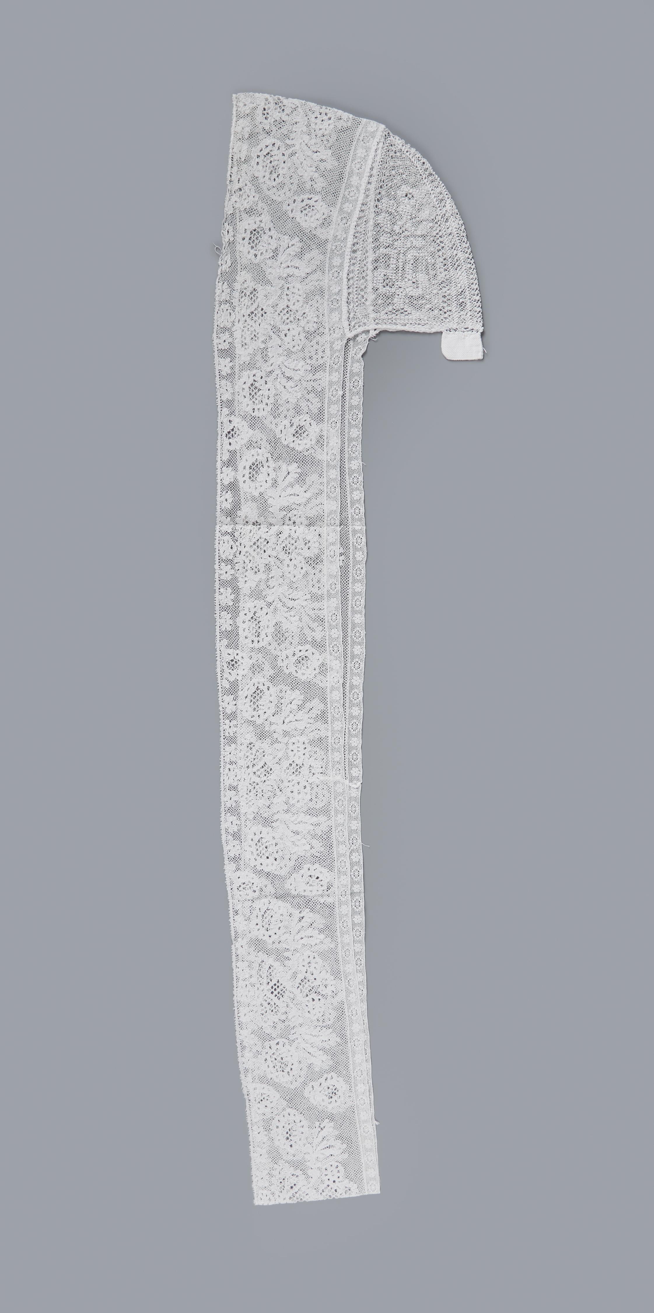 Losgetornde Drentse floddermuts. De bol is van filetknoopwerk. De kantstrook bestaat uit een strook Rijselse kloskant van circa 8 centimeter breed en een machinale kant van 1 centimeter. De kloskant heeft een rapport van circa 16,5 centimeter. In de kant is een siergrond toegepast. De totale wijdte van de kantstrook is 170 centimeter.