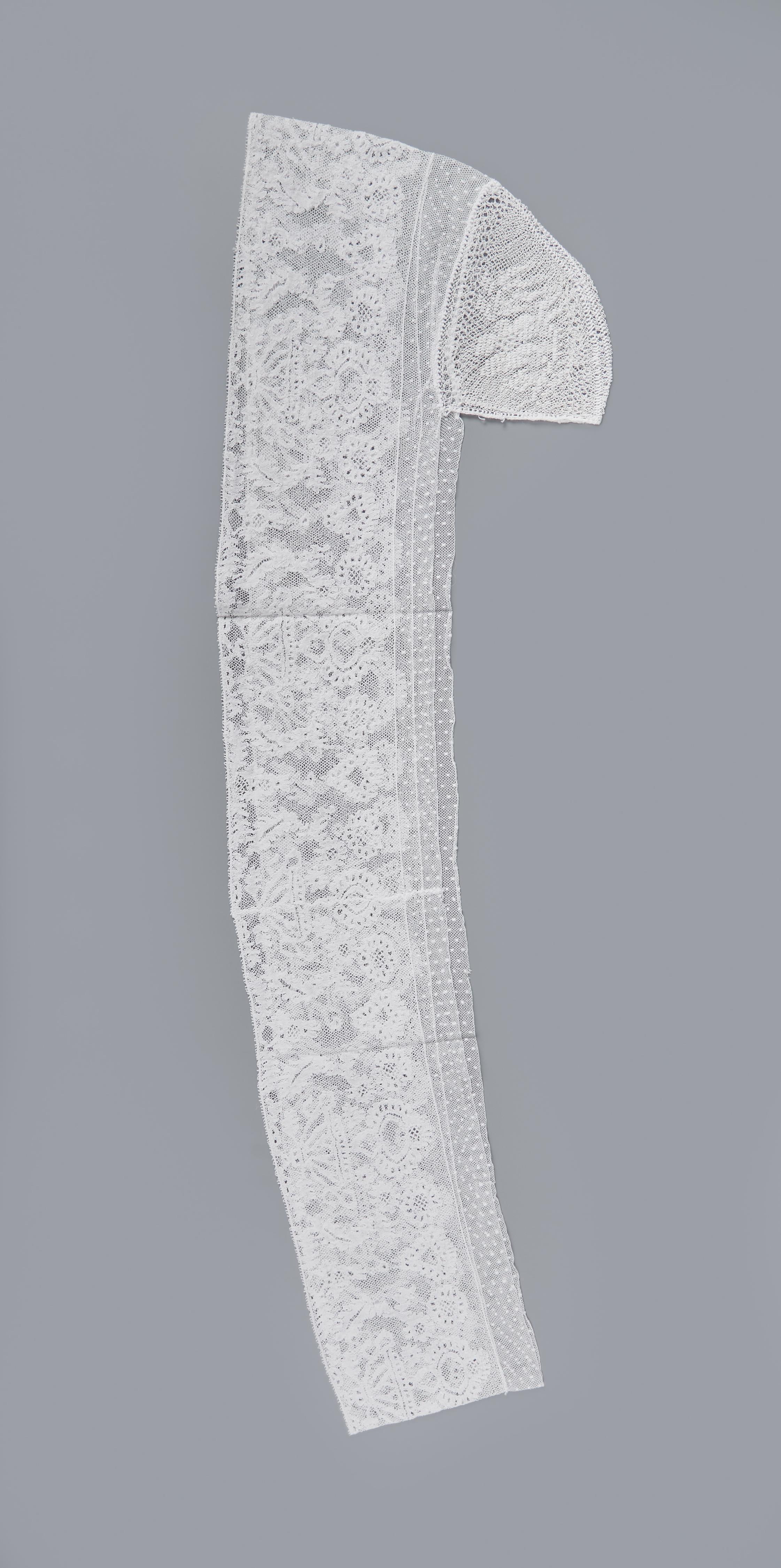 Losgetornde Drentse floddermuts. De bol is van filetknoopwerk. De kantstrook bestaat uit een strook Rijselse kloskant van circa 10 centimeter breed. Hieraan is een strook machinale stiptule van circa 2,5 centimeter breed gezet. De kloskant heeft een rapport van circa 16 centimeter. In de kant is een siergrond toegepast. De totale wijdte van de kantstrook ...