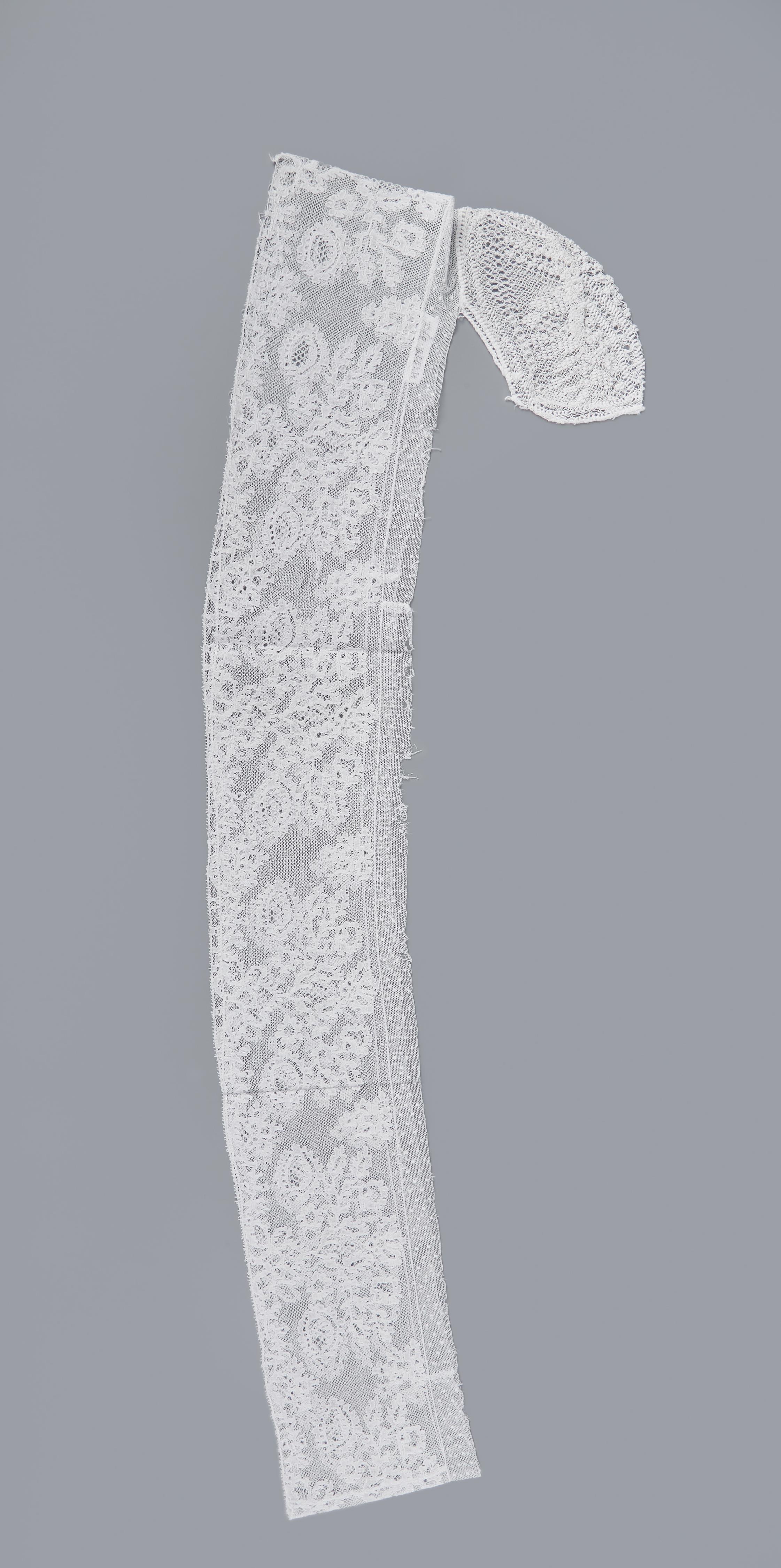 Losgetornde Drentse floddermuts. De bol is van filetknoopwerk. De kantstrook bestaat uit een strook Rijselse kloskant van circa 10 centimeter breed. Hieraan is een strook machinale stiptule van circa 2 centimeter breed gezet. De kloskant heeft een rapport van circa 17 centimeter. De totale wijdte van de kantstrook is 172 centimeter. In de bloemmotieven is ...