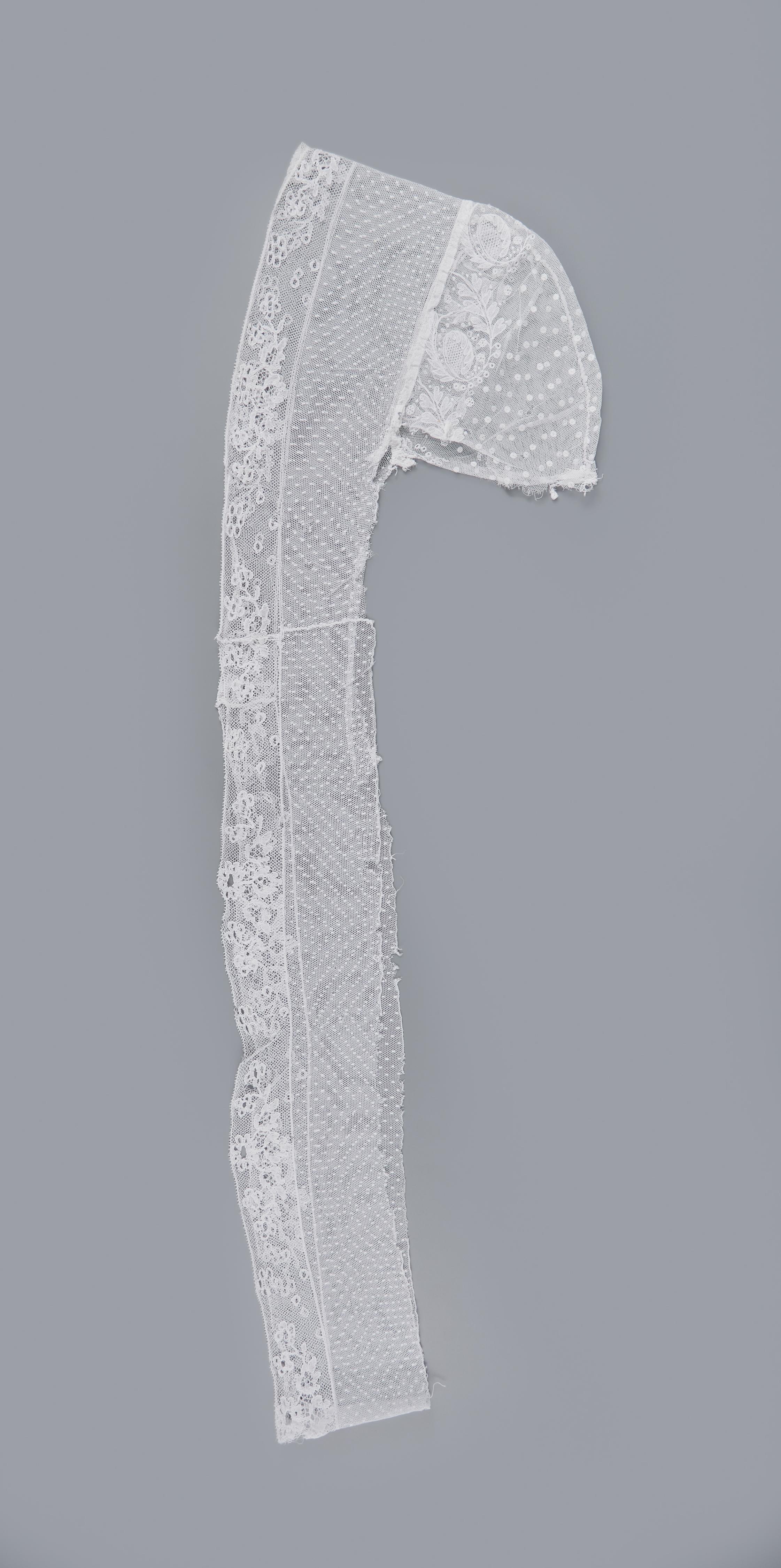 Losgetornde Drentse floddermuts. De bol is van versierde tule. De kantstrook bestaat uit een strook Rijselse kloskant van 4 centimeter breed. Hieraan is een strook machinale stiptule van circa 6 centimeter breed gezet. De kloskant heeft een rapport van circa 18 centimeter. De totale wijdte van de kantstrook is 173 centimeter. In de bloemmotieven is ...