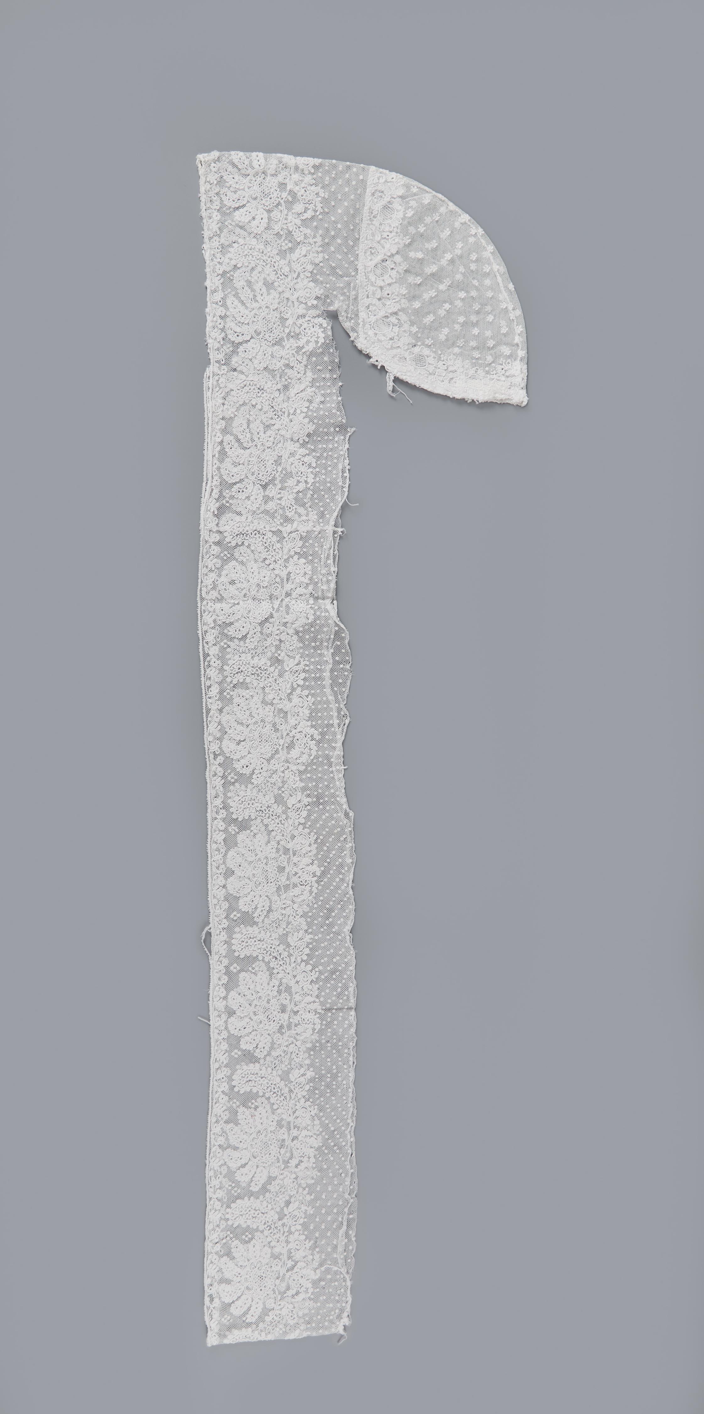 Losgetornde Drentse floddermuts. De bol en de kantstrook zijn vervaardigd van versierde tule. De kantstrook is circa 10,5 centimeter breed. Het patroon van de kant heeft een rapport van circa 10 centimeter. De totale wijdte van de kantstrook is 168 centimeter.