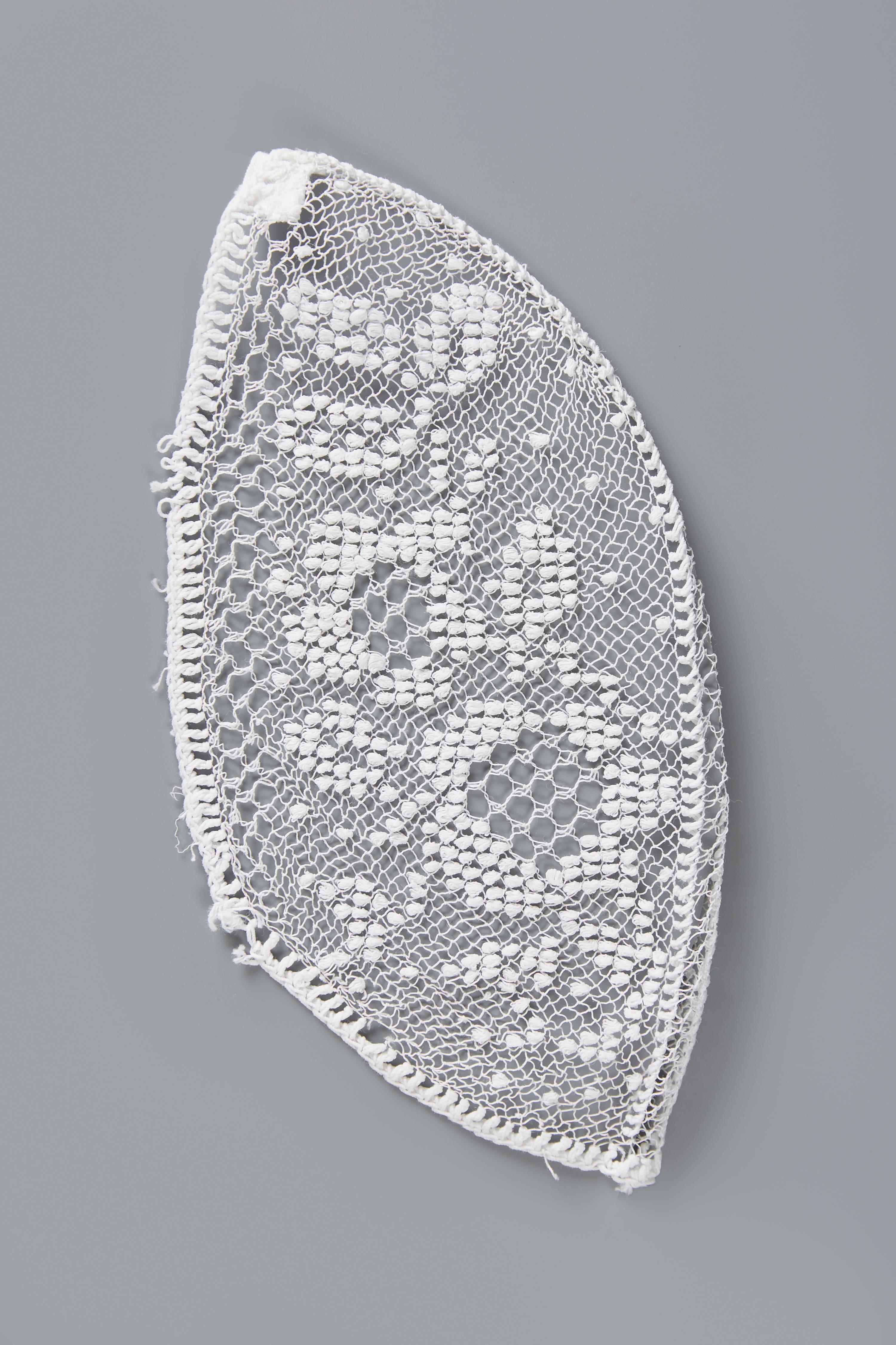 Bol van een Drentse floddermuts. De bol is van filetknoopwerk. Rondom is een randje gehaakt.