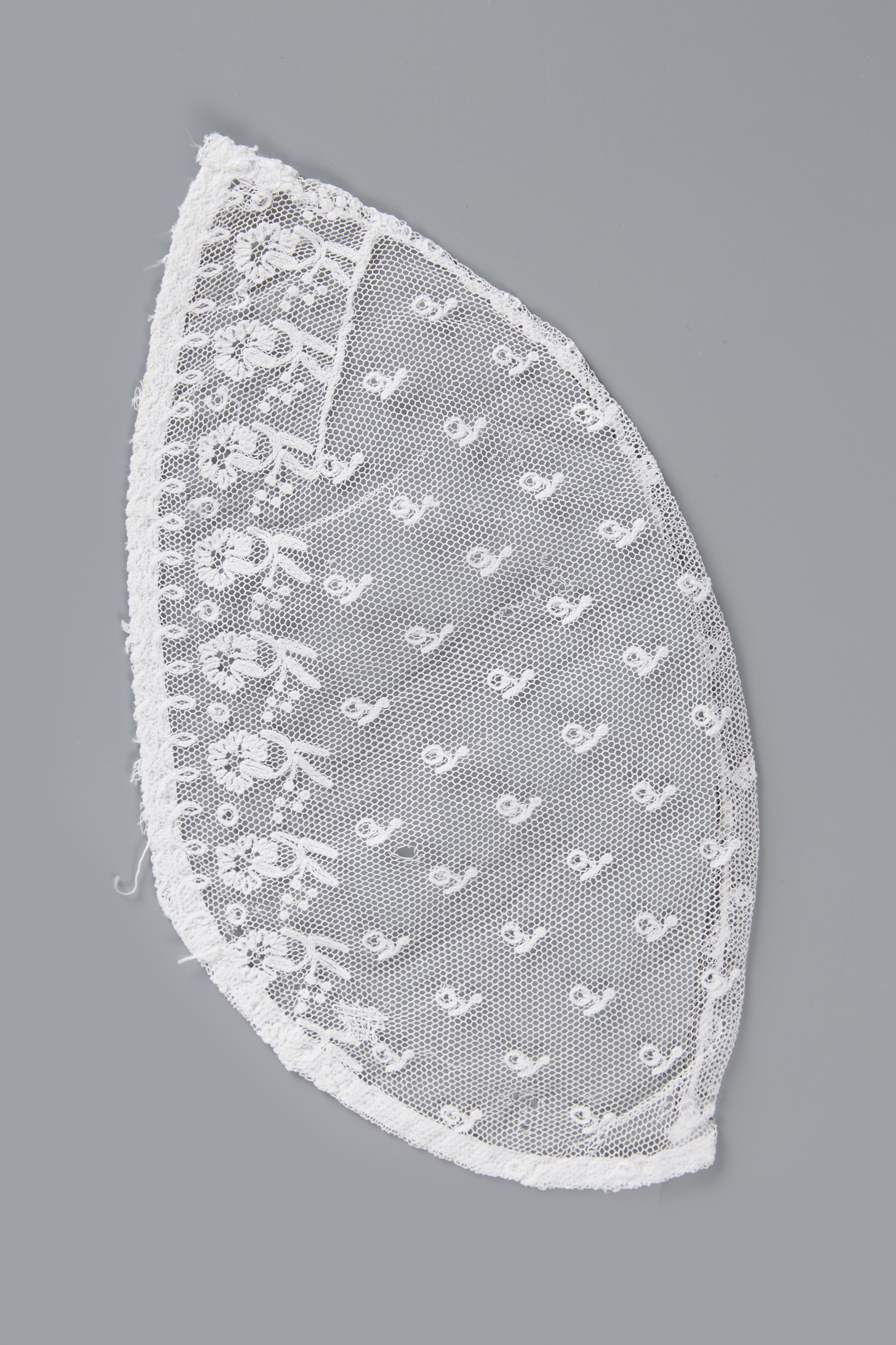 Bol van een Drentse floddermuts. De bol is gemaakt van versierde tule. Tegen de rand is wit band gezet.