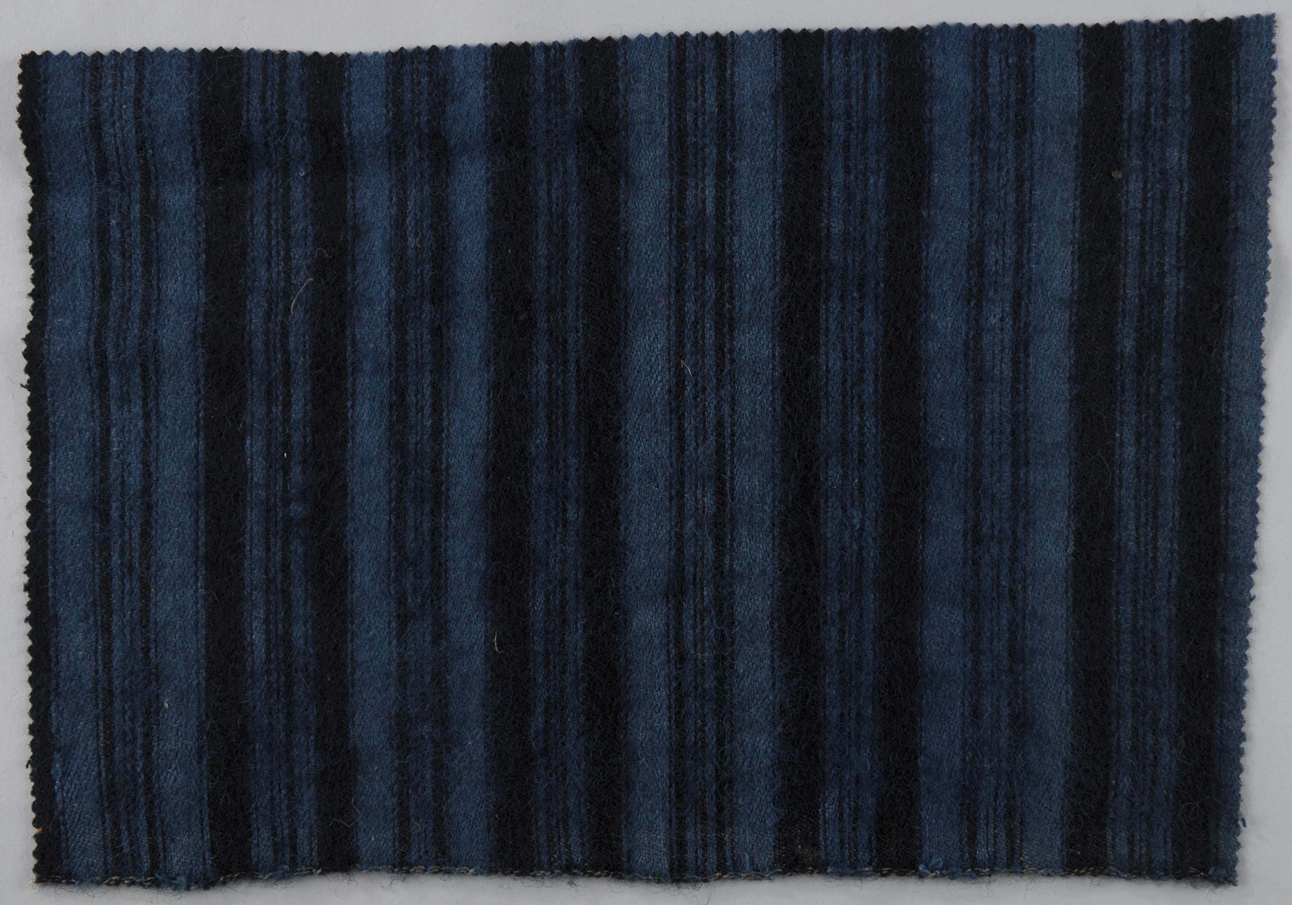 Zwart-blauw gestreept vijfschaft. Het oppervlak is eerst geruwd en vervolgens gekalanderd. De stof heeft linnen kettingdraden en inslagdraden van handgesponnen wol. Het rapport is circa 9 centimeter. Dit fragment is afkomstig uit Drenthe. Dergelijke stoffen werden in verschillende streekdrachten in Noordoost-Nederland gebruikt.
