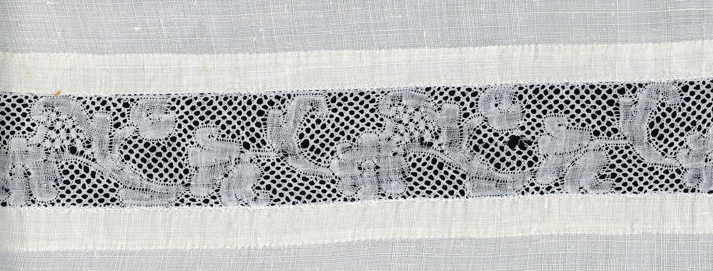 Fragment van een linnen kussensloop met een tussenzetsel van Valenciennes kloskant van 3,5 centimeter breed. De kant heeft een vijfgaatjesgrond. In de motieven is een siergrond van zogenaamde sneeuwvlokken toegepast. In de sloop zijn resten te zien van een geborduurde levensboom met de initialen 'WM'.